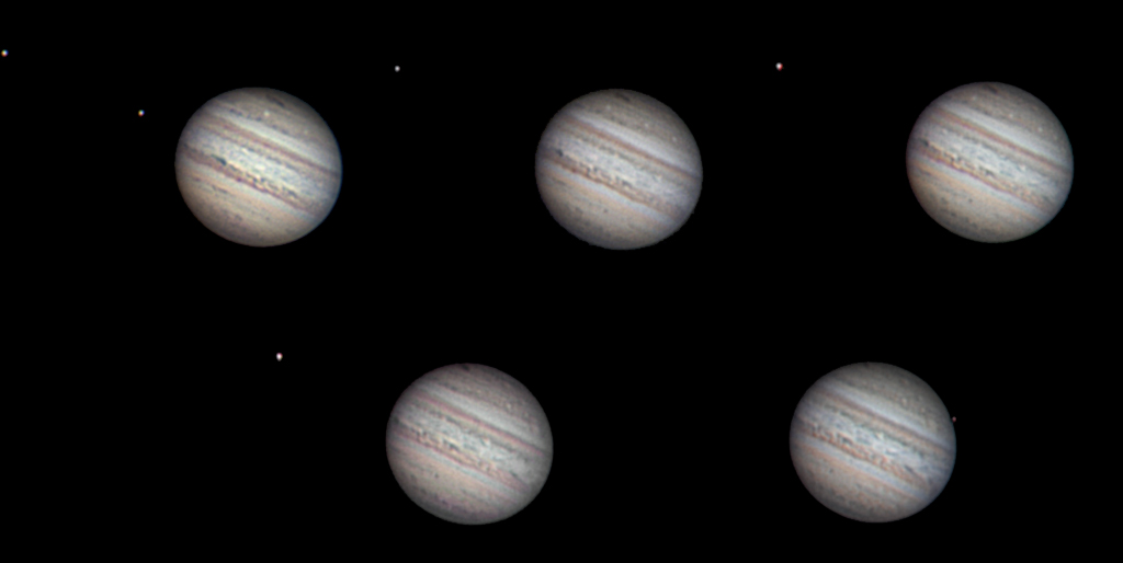 Am 4.8.2009 bedeckte jupiter den 6-mag-Stern 45 Cap. Auf dem letzten Bild der Serie ist der Austritt des Sterns sichtbar. Auf allen Bildern ist der mittlerweile sehr in die länge gezogene Impaktfleck zu sehen.