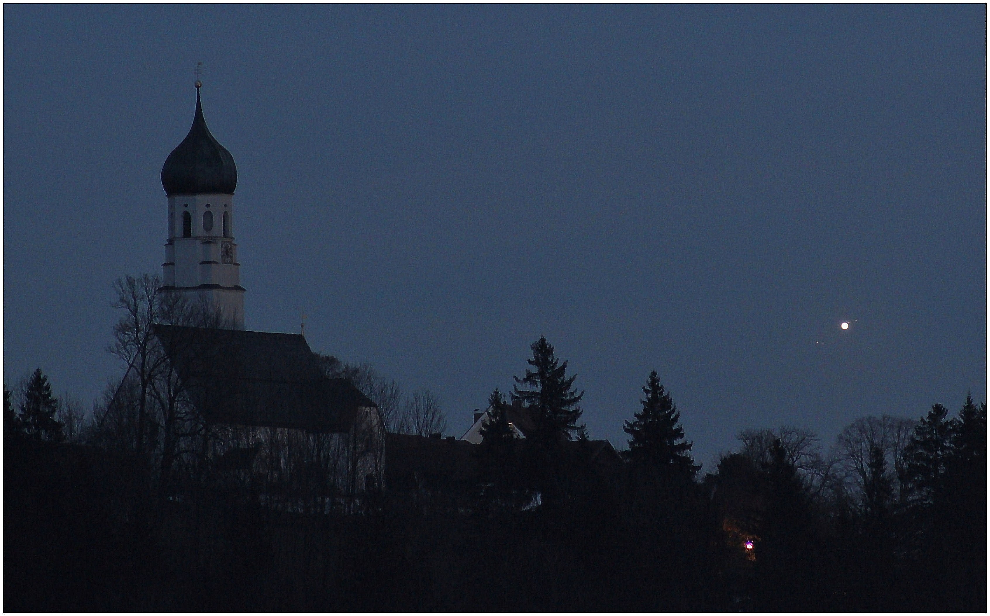 Eine lange Geschichte und ein schöner Anblick: Nur mit viel Wetterglück war es möglich, den Aufgang des Jupiter mit seinen vier Galileischen Monden neben der Kirche St. Michael in Gaißach bei Bad Tölz zur rechten Zeit in der Dämmerung zu fotografieren.
