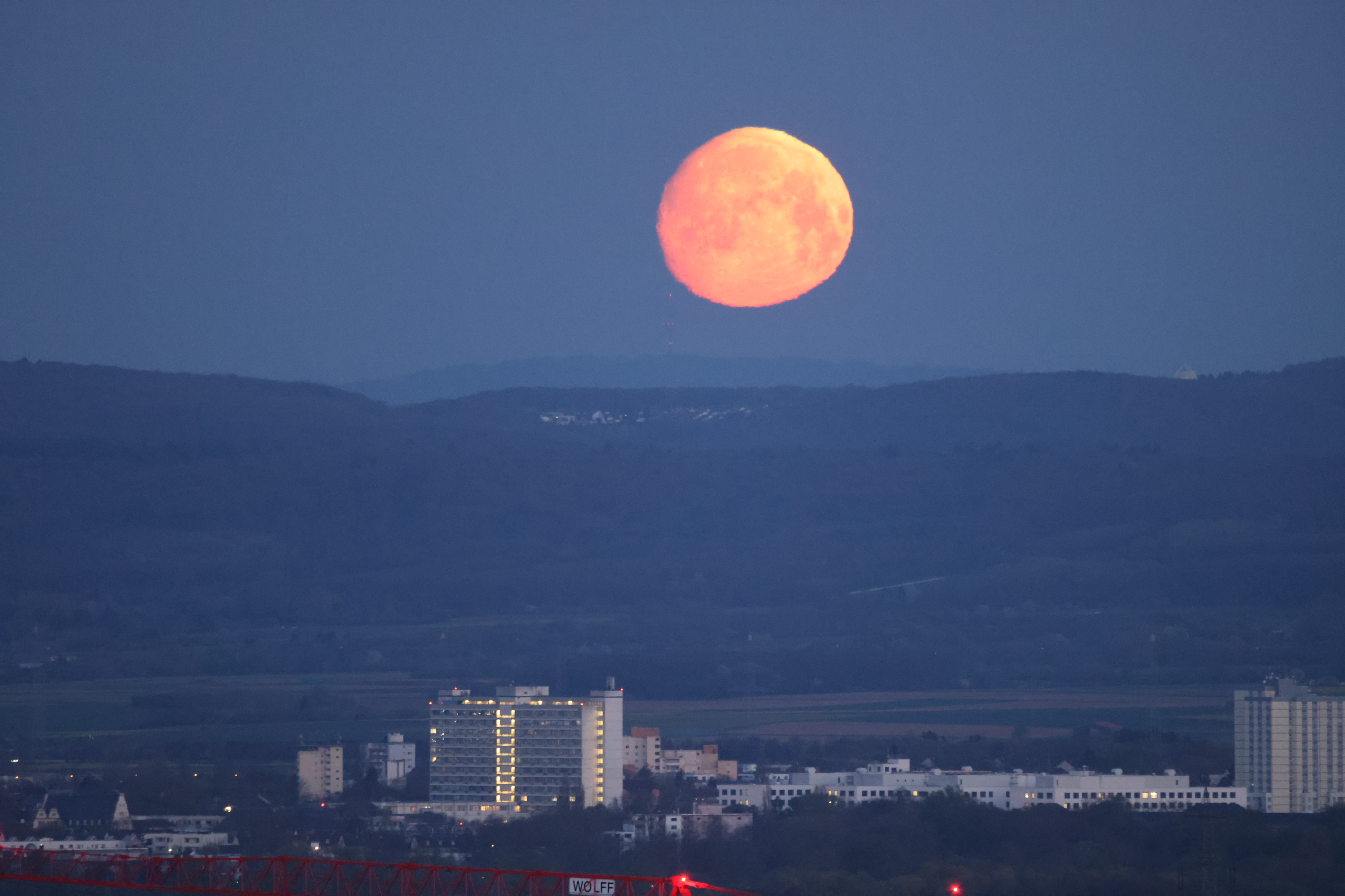 Ist der Mond doch nur ein Stück Käse? Monduntergang am 25. April 2021 um 5:44 Uhr in Frankfurt/Main. War früh wach. Fotografiert vom Balkon eines Wohnhochhauses in Frankfurt mit kürzlich erworbener CANON EOS R5, 600 mm f11, 1/15 s, ISO 12800.