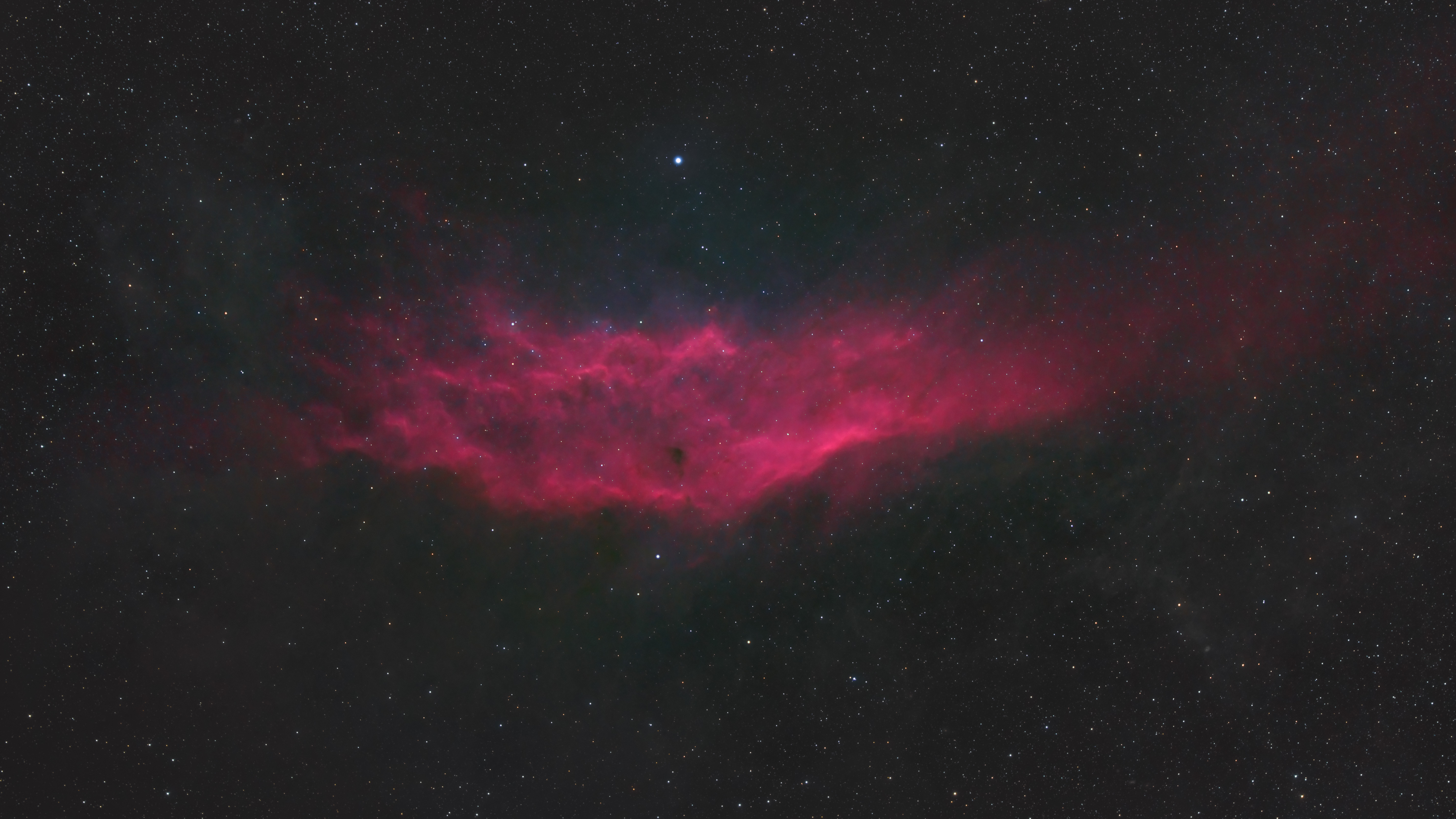 Der Kaliforniennebel NGC1499 ist ein weitläufiger Emmissionsnebel im Orion-Arm unserer Milchstraße. Das auffällig rötliche Leuchten stammt von ionisierten Wasserstoffatomen, welche ständig wieder mit Elektronen rekombinieren und dabei das charakteristische Licht von sich geben. Angeregt wird diese H-II-Region vom Klasse-O-Stern Xi Persei, welcher der hellste Stern in diesem Bild ist.