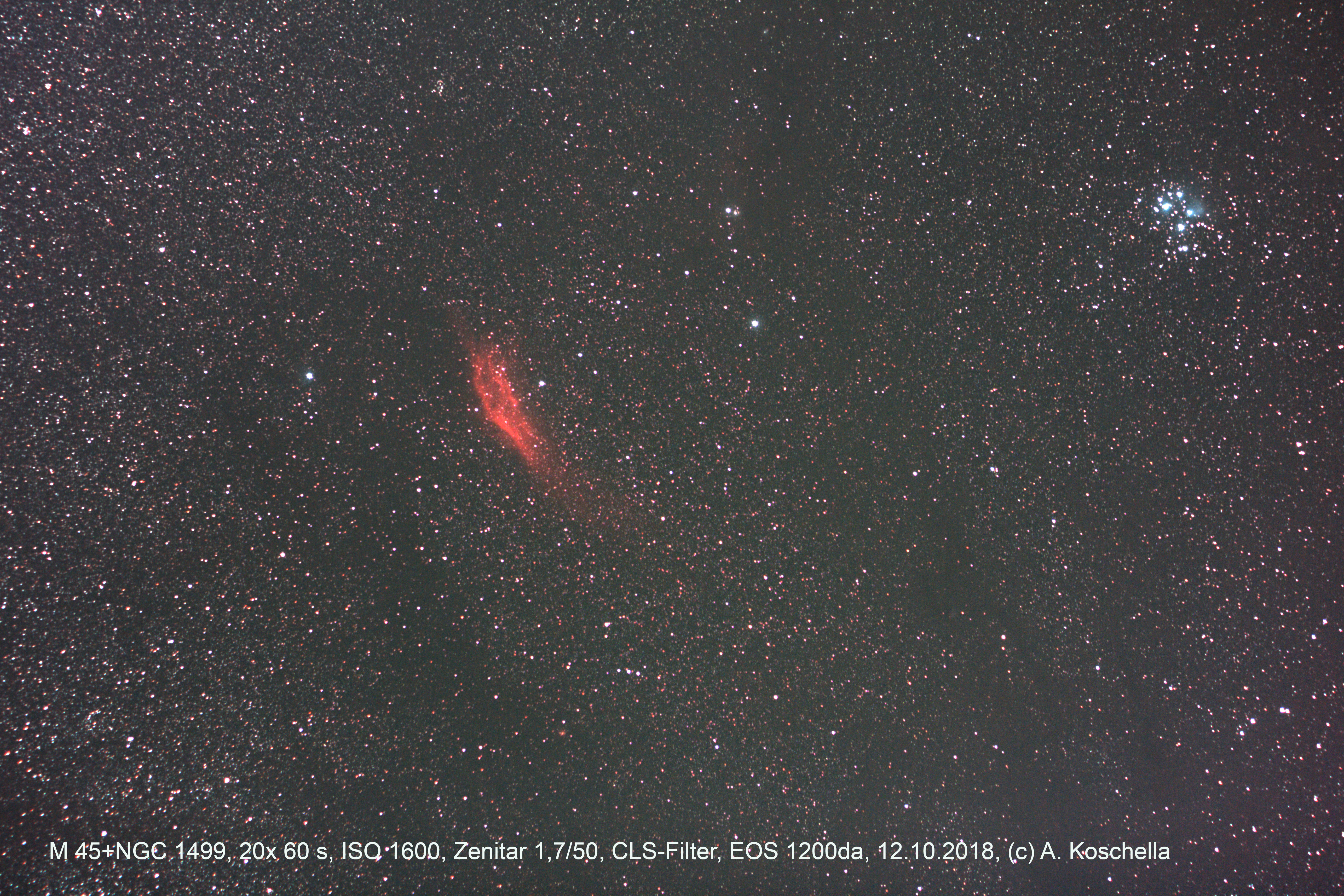 Der diesjährige Herbsturlaub führte uns in die ländliche Gegend am Staffelsee in Bayern. Die Wetterprognose war gut und die Mondphase günstig. Die Mitnahme des leichten Astrogepäcks hat sich also gelohnt. Kaliforniennebel und Plejaden haben sich mit Hilfe der Staradventurer gut ablichten lassen. Ich werde später noch ein Bild hochladen, das einen Tag später im lichtverschmutzten Jena entstanden ist.