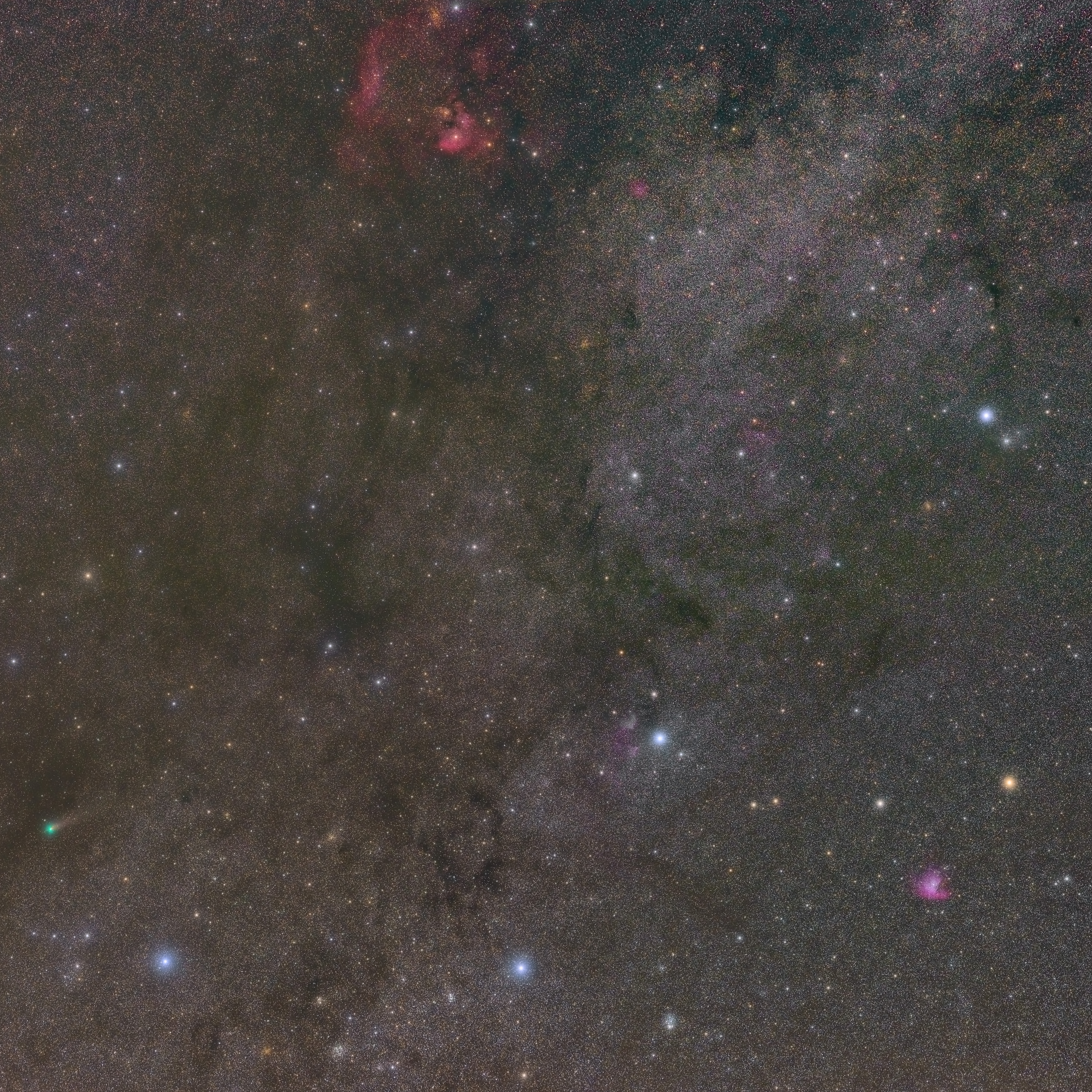 Das Sternbild Kassiopia ist durch die zickzak-artige Form sehr einfach am Sternenhimmel zu erkennen. Das so genannte "Himmels-W" besteht dabei aus den Riesensternen Caph, Schedar, Gamma Cassiopeiae, Ruchbah und Segin. Diese reichen quer über die Milchstraße und schließen zahlreiche Dunkelwolken, Emmissions- und Reflexionsnebel mit ein. Als hellste Emissionsnebel sieht man den so genannten Pacman-Nebel nahe Schedar und NGC 7822 im benachbarten Sternbild Kepheus. In der linken unteren Ecke kann man den Kometen 21P/Giacobini-Zinner erkennen, der zu diesem Zeitpunkt das Sternbild passierte. Das gezeigte Foto ist ein Panorama aus zwei Aufnahmen zu je 50 x 2 Minuten. Aufgenommen am 11. August 2018 mit einer Nikon D750 und einem 135-mm-Sigma Art bei Blende 3,5 und ISO 800. Nachführung mittels Astrotrac, Bearbeitung mit Deep Sky Stacker und Adobe Photoshop.