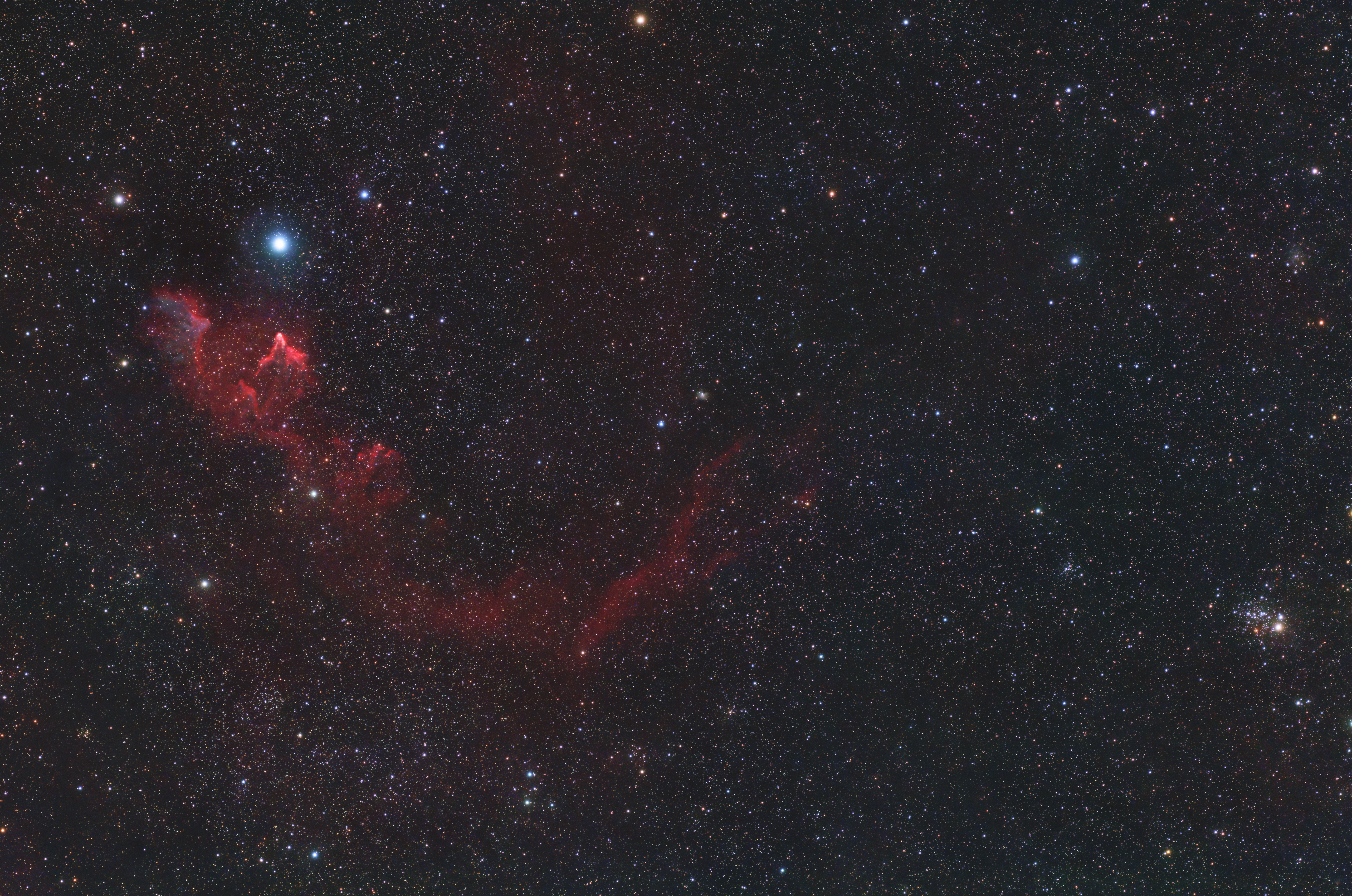 In der Bildmitte ist ein kleiner Reflexionsnebel (RN) ohne offizielle Bezeichnung zu erkennen. Der dreieckförmige Dunkelnebel, der den RN etwa an der 1-Uhr-Position im Bild einschneidet, trägt die Bezeichnung Dobashi 3771. Die Aufnahme entstand in zwei klaren, kalten Novembernächten des Jahres 2022.