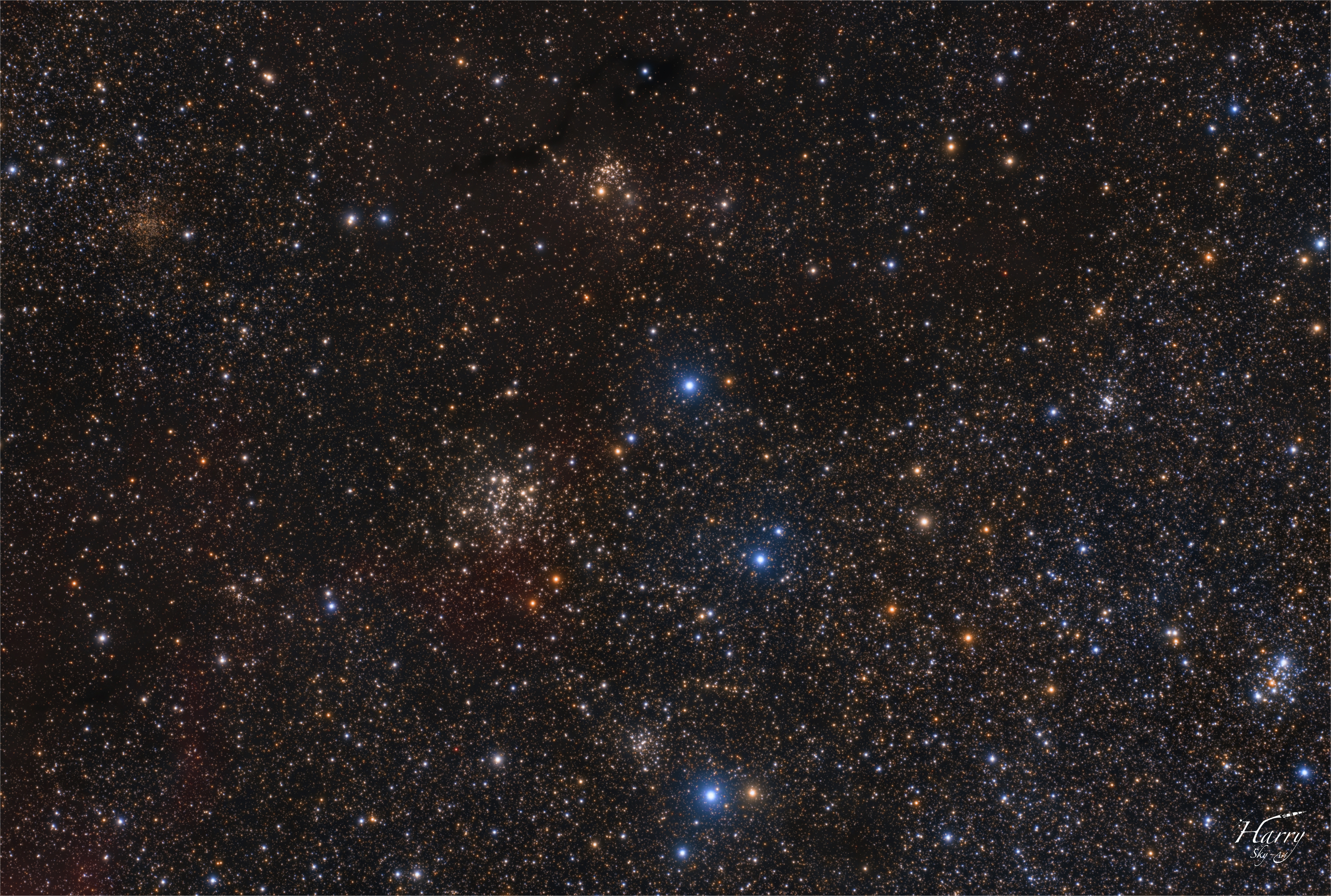 das Sternbild Kassiopeia steigt nun immer höher in den den Zenit. Ein Besuch mit dem Fernglas oder Teleskop ist sehr lohnenswert. Es wimmelt nur so vor Sternhaufen die gut beobachtet werden können. Ein kurzer Ausflug mit meiner Kamera hat dieses beeindruckende Sternfeld zum Vorschein gebracht. Es zeigt nicht nur Sternhaufen und galaktischen Staub, sondern auch zarte Ausläufer von H-Alpha-Bereichen. Ich habe insgesamt 6h belichtet und daraus ein H-Alpha-LRGB bearbeitet. Hoffe es gefällt euch, viel Spaß beim Anschauen.
