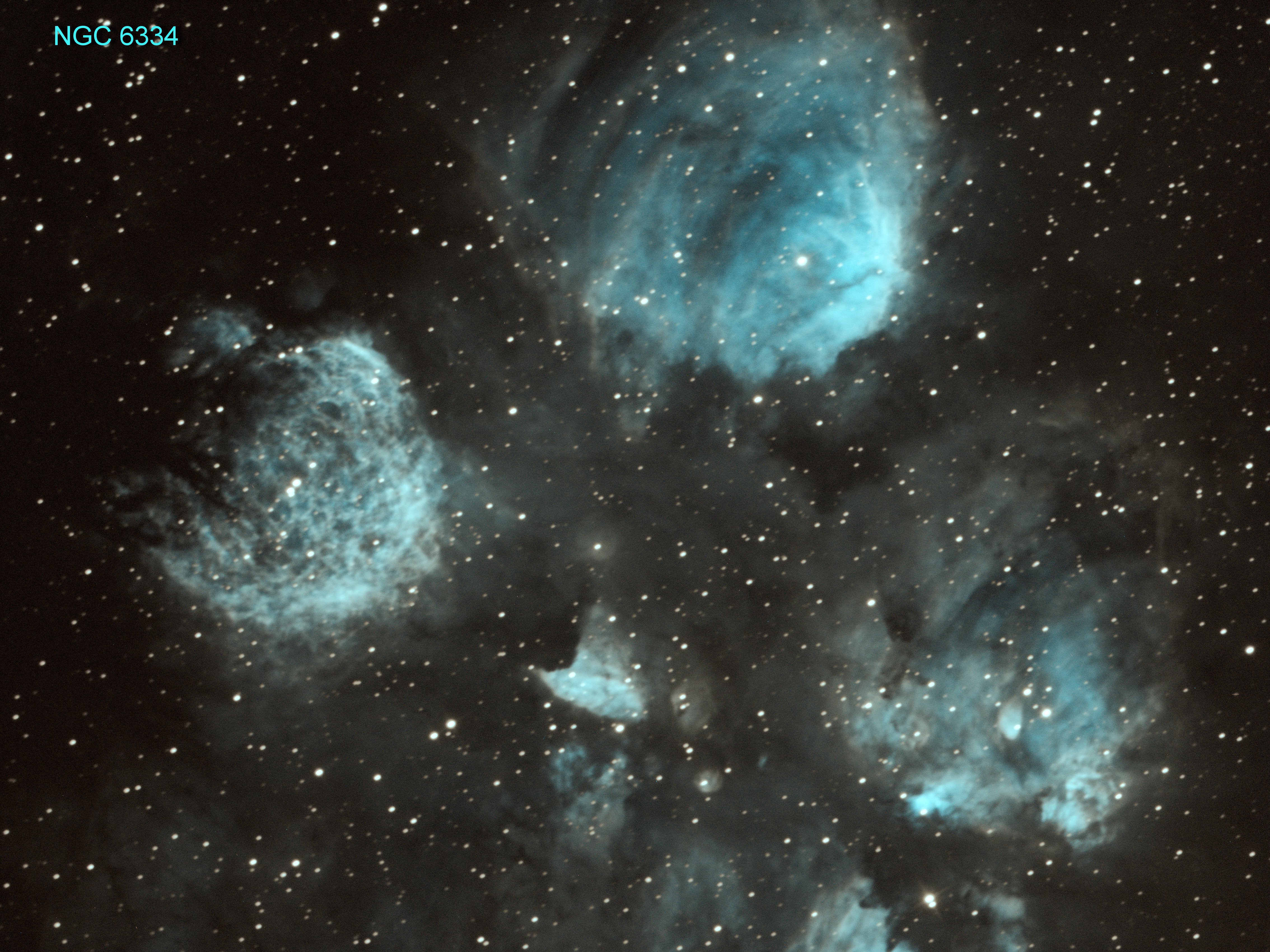 NGC 6334 im Sternbild Skorpion. Aufnahme vom Juli 2023 in Namibia. Mit den Filtern H-Alpha, S2 und OIII belichtet.