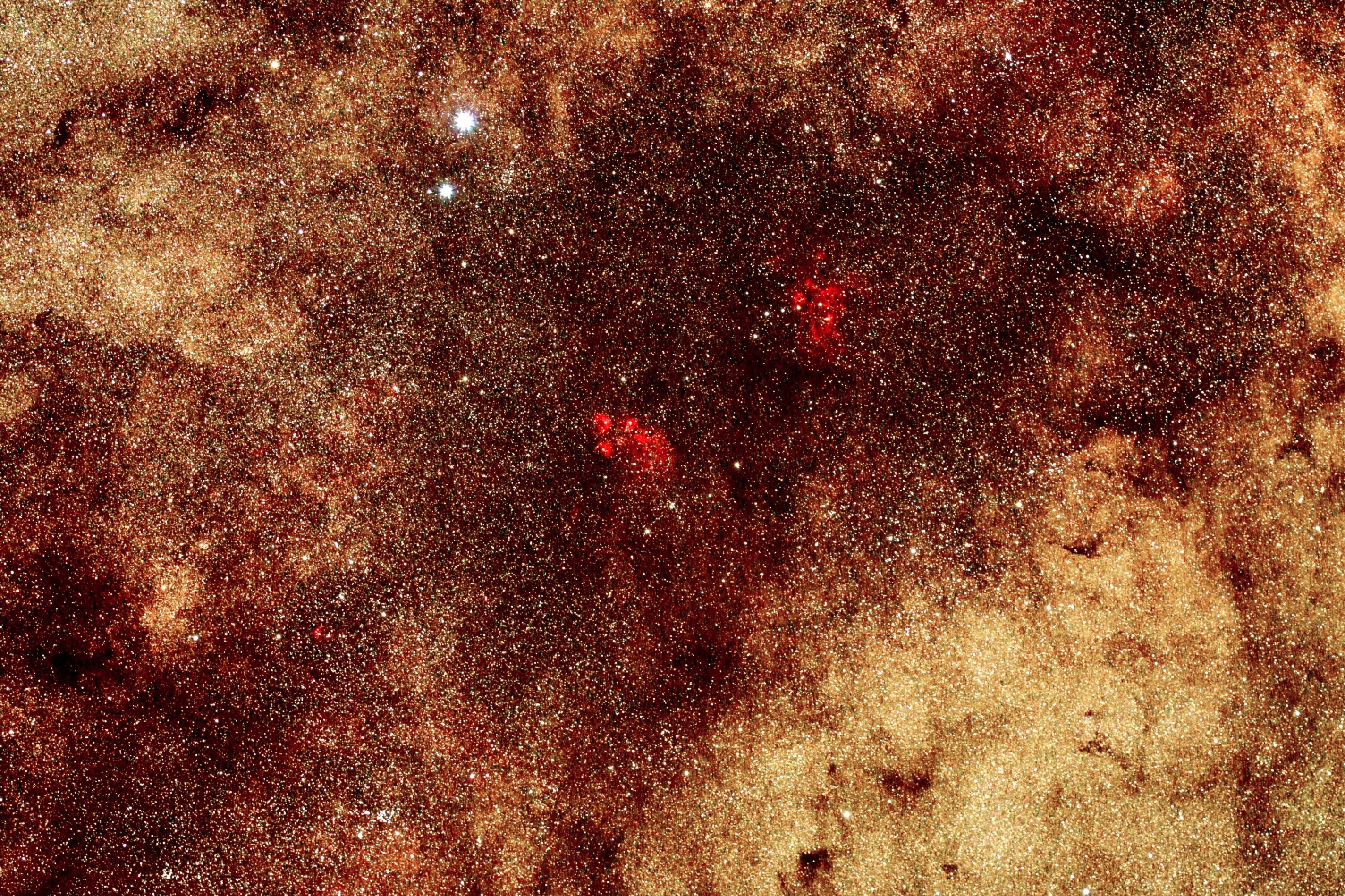 Eingebettet in eine etwas weniger mit Sternwolken bedeckte Region der Milchstrasse im Schwanz des Skorpions findet man neben dem Katzenpfotennebel NGC 6334 auch den durch eine markante Sternenkette auffallenden NGC 6357. Beide Nebel sind Beispiel für "interstellar reddening" - der blaue Anteil des Lichts wird durch Staubpartikel herausgefiltert.