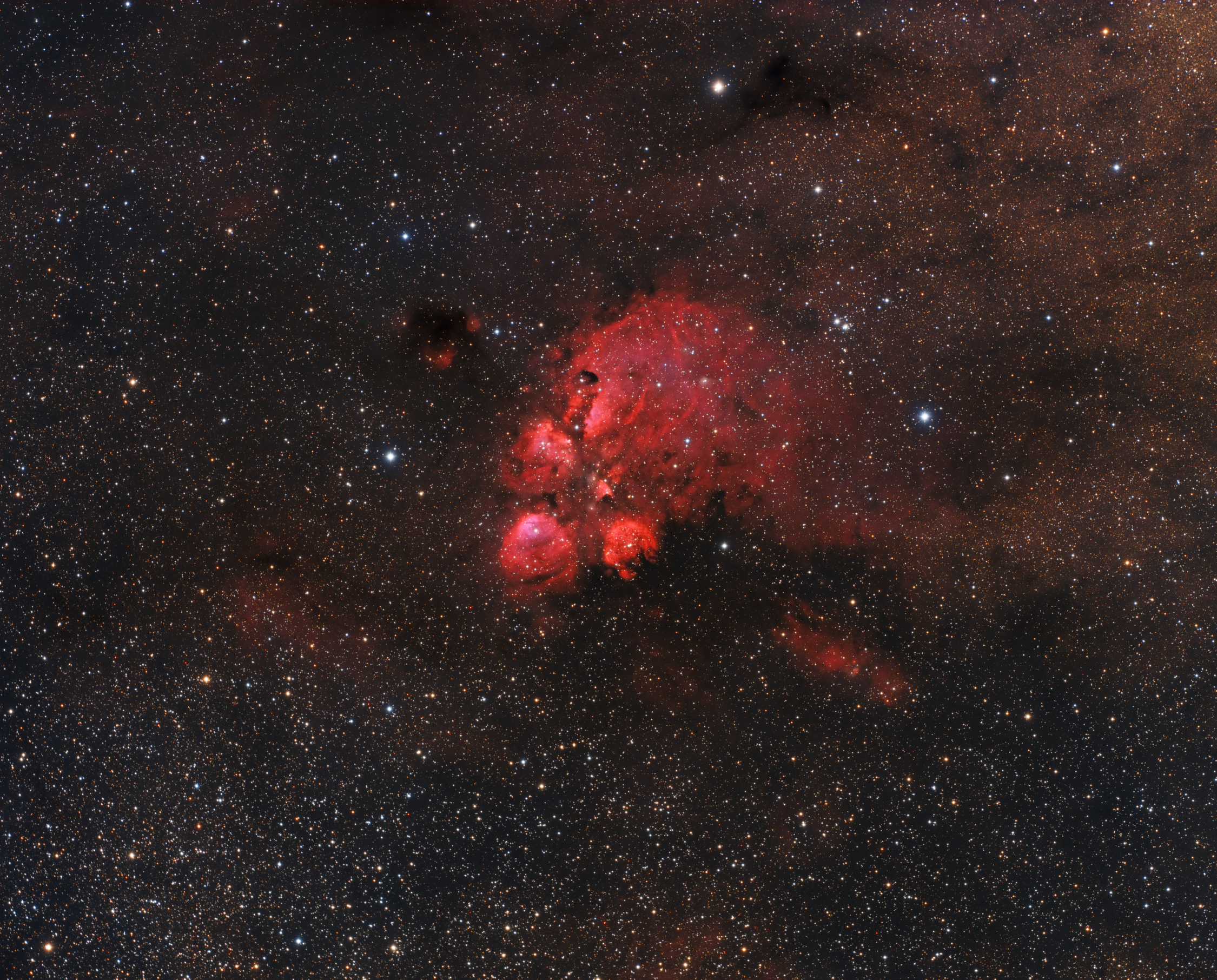 Als freiberuflicher Musiker bin ich beruflich gerade schwer getroffen von der Corona-Krise, eine Konzertabsage nach der anderen trudelt ein. Positiv betrachtet habe ich aber nun endlich Zeit, meine Bilder zu bearbeiten, und einige liegen noch auf der Festplatte. Nach vier Jahren Namibia in Folge, gehen mir etwas die Standardobjekte aus, zumindest die, die zu meinem Setup passen. So war ich 2019 etwas in Verlegenheit, passende Objekte zu finden. NGC 6334 und NGC 6357 passten nicht gemeinsam ins Feld meines Takahashi, und für 200 mm Brennweite sind sie nicht groß genug. Ich musste mich also für einen der beiden Nebel entscheiden, mit entsprechend großem Feld. Der Gasnebel liegt mitten in einer ausgedehnten Dunkelwolke, sein Licht ist deutlich vom Staub gerötet und erscheint mehr dunkelrot als andere, junge Gasnebel.