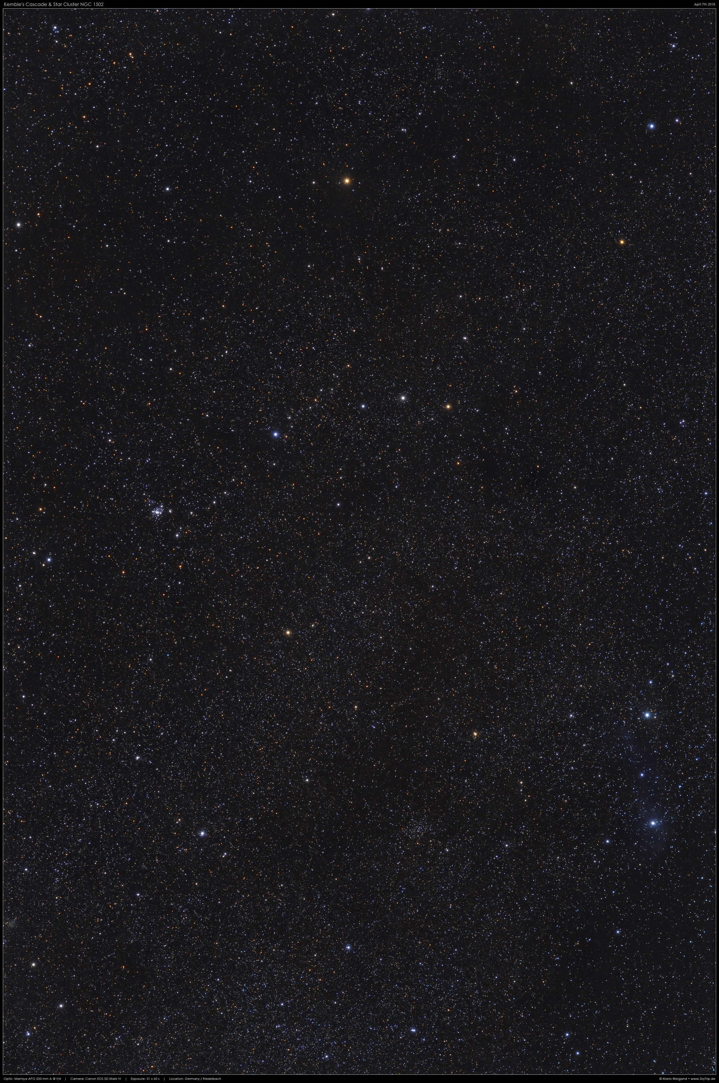 Der Asterismus mit der Bezeichnung "Kemble's Cascade" (zu Ehren Lucius Kemble) besteht aus einer etwa 150 Bogenminuten langen Anordnung verschieden heller Sterne, die scheinbar eine gerade Linie bilden. Die Kaskade befindet sich im Sternbild Giraffe und ist ein das ganze Jahr beobachtbares Objekt für Feldstecher. Neben der Sternkette sind auch noch die Sternhaufen NGC 1502, IC 361, Berkeley 10 und Tombough 5 zu sehen. Unten rechts am Bildrand liegen die beiden Reflexionsnebel vdB 14 und 15, die gerade so erkennbar sind. Außerdem findet man den Planetarischen Nebel NGC 1501.