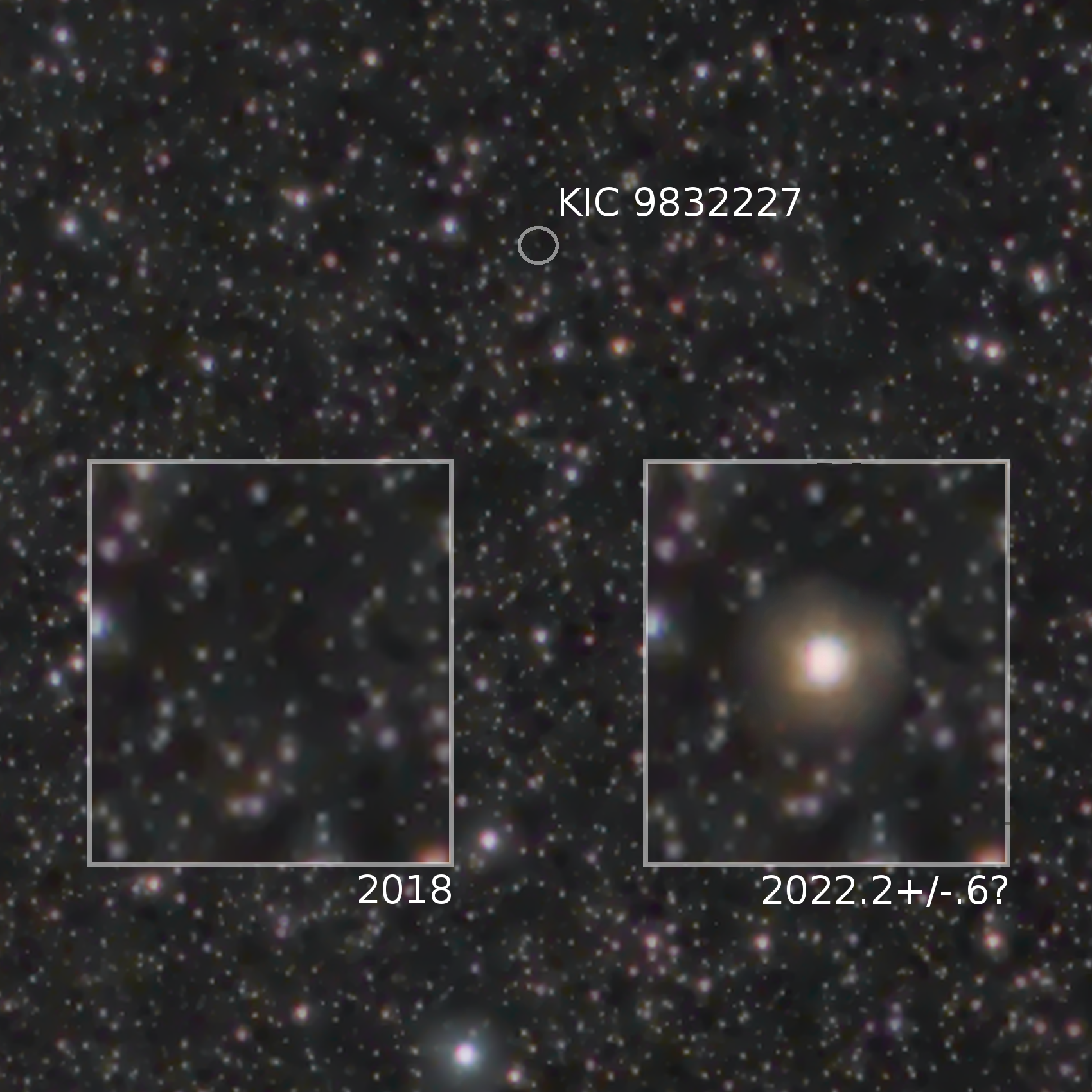Hier noch mal KIC 9832227 mit einem Ausschnitt, wie man ihn im Mai 2018 sehen konnte, sowie als Vergleich, ein simulierter Ausschnitt, wie der Stern als Rote Nova nach den Vorhersagen im Februar 2022 aussehen könnte.