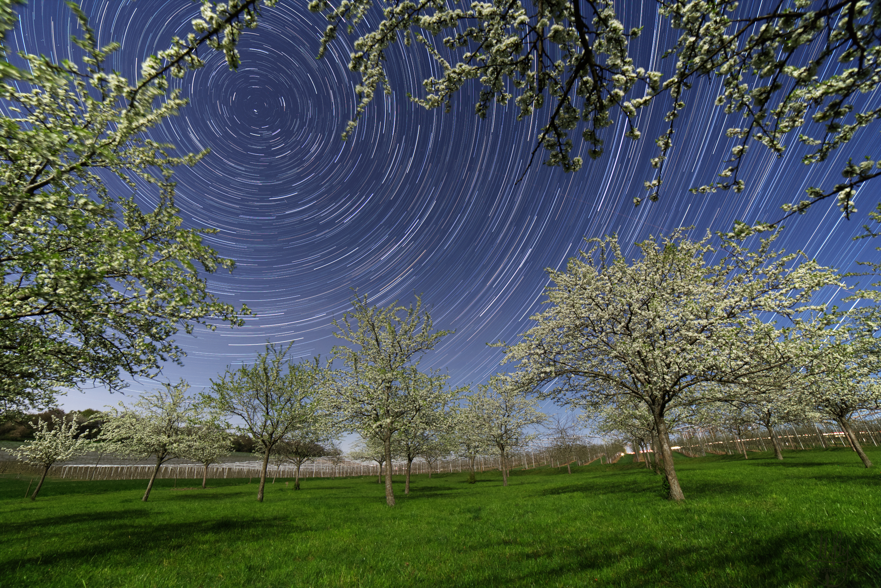 Ja, es war eine helle und duftende Mondnacht inmitten einer blühenden Kirschbaumplantage bei Merzkirchen im Saargau nahe der Grenze zu Luxemburg. Während der Mond hoch über dem Südhorizont steht, ist auf dieser Aufnahme die Kamera 75 Minuten lang in die entgegengesetzte Mondrichtung ausgerichtet. Der Blick geht nach Nordosten. Es zeigt sich der nördliche Sternenhimmel als Strichspuren mit dem Polarstern im Zentrum. Die Landschaft ist durch das Licht des Erdtrabanten hell erleuchtet und die Luft ist vom Kirschblütenduft verzaubert.
