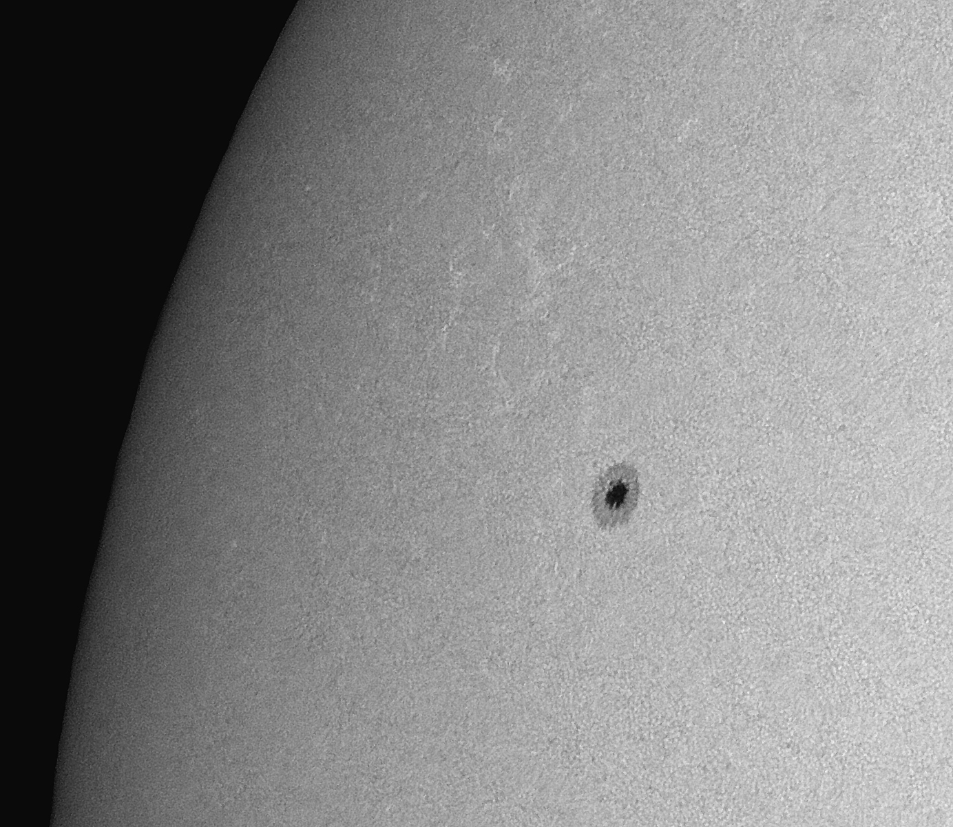 Groß ist dieser Sonnenfleck mit der Bezeichnung AR 12662 wirklich nicht. Interessant bei der visuellen Beobachtung war der dunklere Außenrand der Penumbra. Kann man auf dem Foto schon schwach erkennen. Auch die langsam von unten in die Umbra wachsende Lichtbrücke war schön anzusehen. Im oberen Bereich waren zwei auffallend helle Flecken zu sehen.