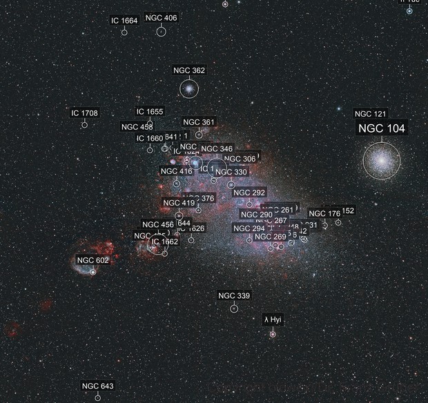 Die SMC liegt rund 200000 Lichtjahre von uns und 75000 Liochtjahre von der LMC entfernt. Sie hat einen Durchmesser von rund 7000 Lichtjahren, enthält einige 100 Millionen Sterne und hat rund 7 Miiliarden Sonnenmassen. Mit der LMC ist sie durch eine Gasbrücke verbunden, ein Hinweis für Gezeiteninteraktionen zwischen den beiden Galaxien. Darüber hinaus haben beide eine gemeinsame Hülle aus neutralem Wasserstoff. In dieser Gasbrücke findet rege Sternentstehung statt, gut zu erkennen am rot leuchtenden ionisierten Wasserstoff. Mit Gaia wurden RR Lyrae-Sterne in dieser Brücke identifiziert. Bei den RR Lyrae-Sternen handelt es sich um massearme Sterne (rund 50% der Sonnenmasse), die sich nach Verlassen des roten Riesenasts gerade am Horizontalast und dort im Instabilitätsstreifen befinden. Sie sind in dieser Phase mindestens 10 Milliarden Jahre alt und sind daher ein leicht zu bestimmender Indikator für die Entwicklungsgeschichte eines Sternsystems. Zwei Umstände machen diese Aufnahme besonders bemerkenswert. Zum einen ist mir zumindest im Amateurbereich keine Aufnahme bekannt, die diese Gas- und Sternbrücke zwischen der LMC und der SMC so detailreich darstellt. Zum anderen fällt die sehr hohe Anzahl an Hintergrundgalaxien (PGC) auf, wobei aber ein ringförmiger Bereich um die SMC fast frei von Galaxien zu sein scheint. Da das recht unwahrscheinlich zu sein scheint, liegt die Vermutung nahe, daß die SMC von einem Staub- und Gashalo umgeben ist und daher das Fehlen von Hintergrundgalaxien in diesem Bereich auf Extinktion zurückzuführen ist. Letztlich ist noch anzumerken, daß auf der Aufnahme auch der erst vor einigen Jahren entdeckte Röntgenpulsar SXP 1062 zu finden ist.