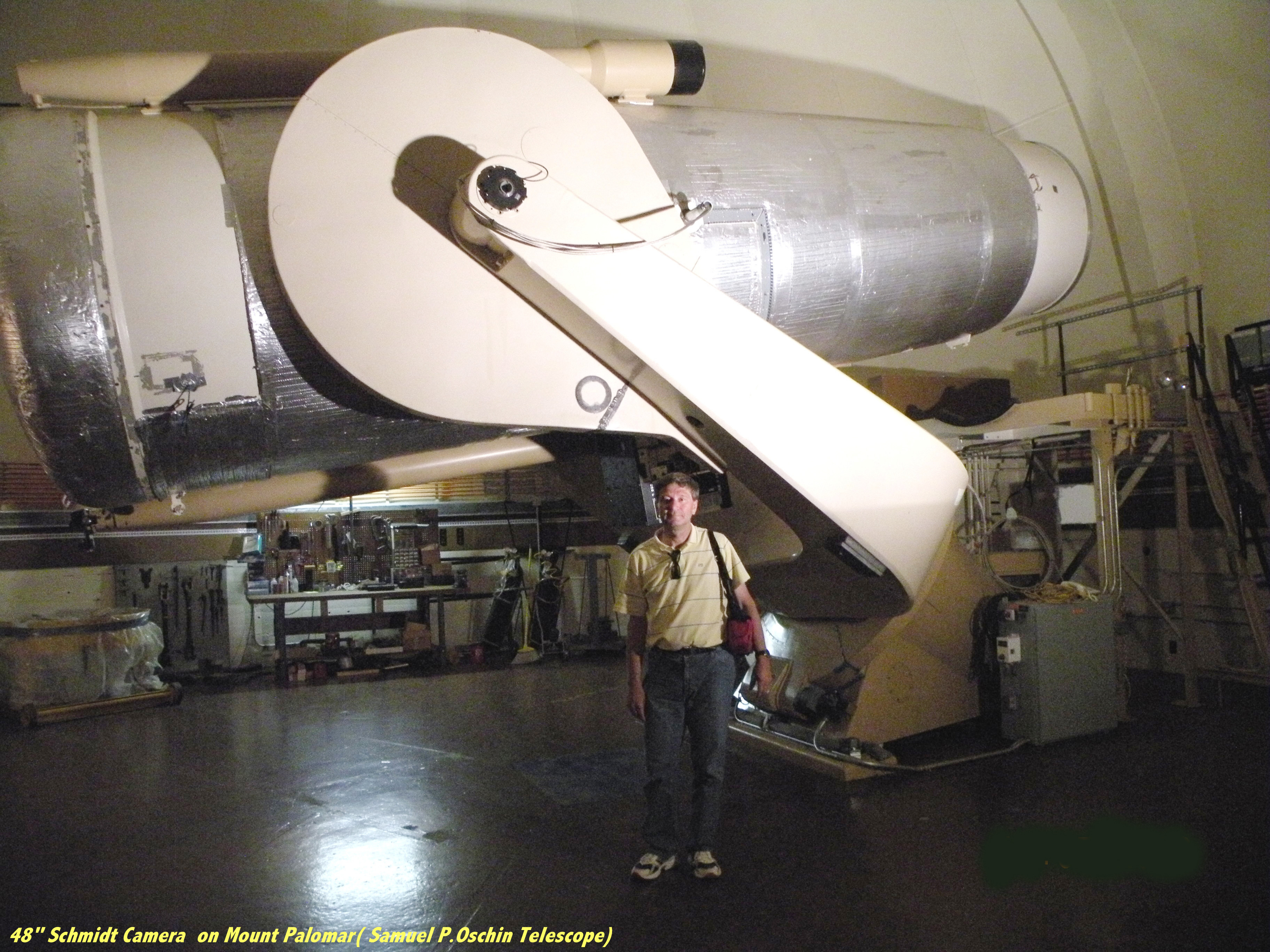 Das Eris-Entdeckerinstrument, die 48"-Schmidtkamera (Big Schmidt, jetzt Samuel P. Oschin Telescope) auf dem Mount Palomar mit dem Autor im Jahr 2015.