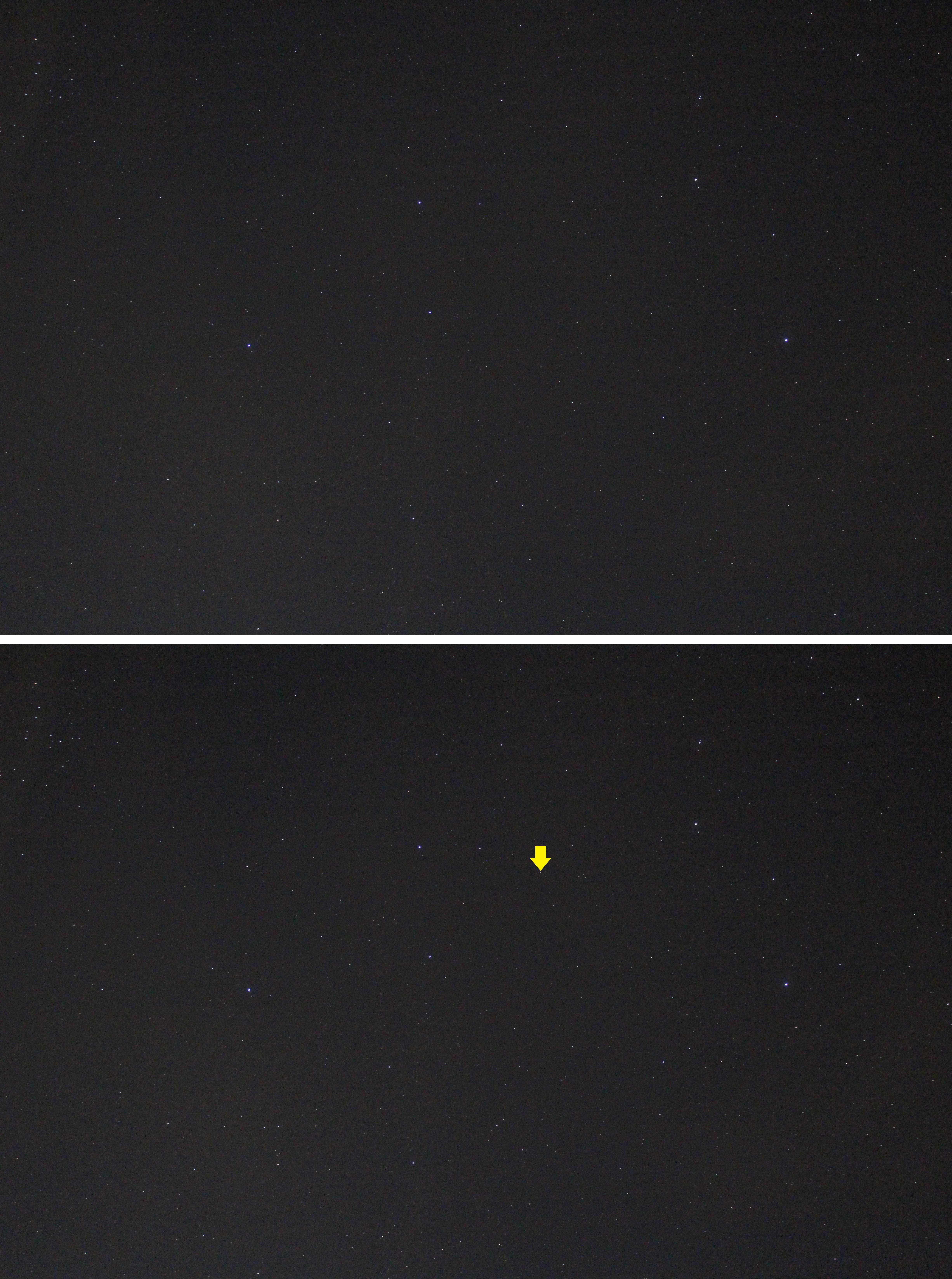 Das Sternbild Löwe mit Kleinplanet Vesta, aufgenommen am Abend des 8. April 2021. Auf dem unteren Bild, das zur gleichen Zeit mit dem gleichen Belichtungsparametern wie das obere Bild aufgenommen wurde und das auch den gleichen Himmelsausschnitt zeigt, ist der Kleinplanet Vesta mit einem gelben Pfeil markiert.