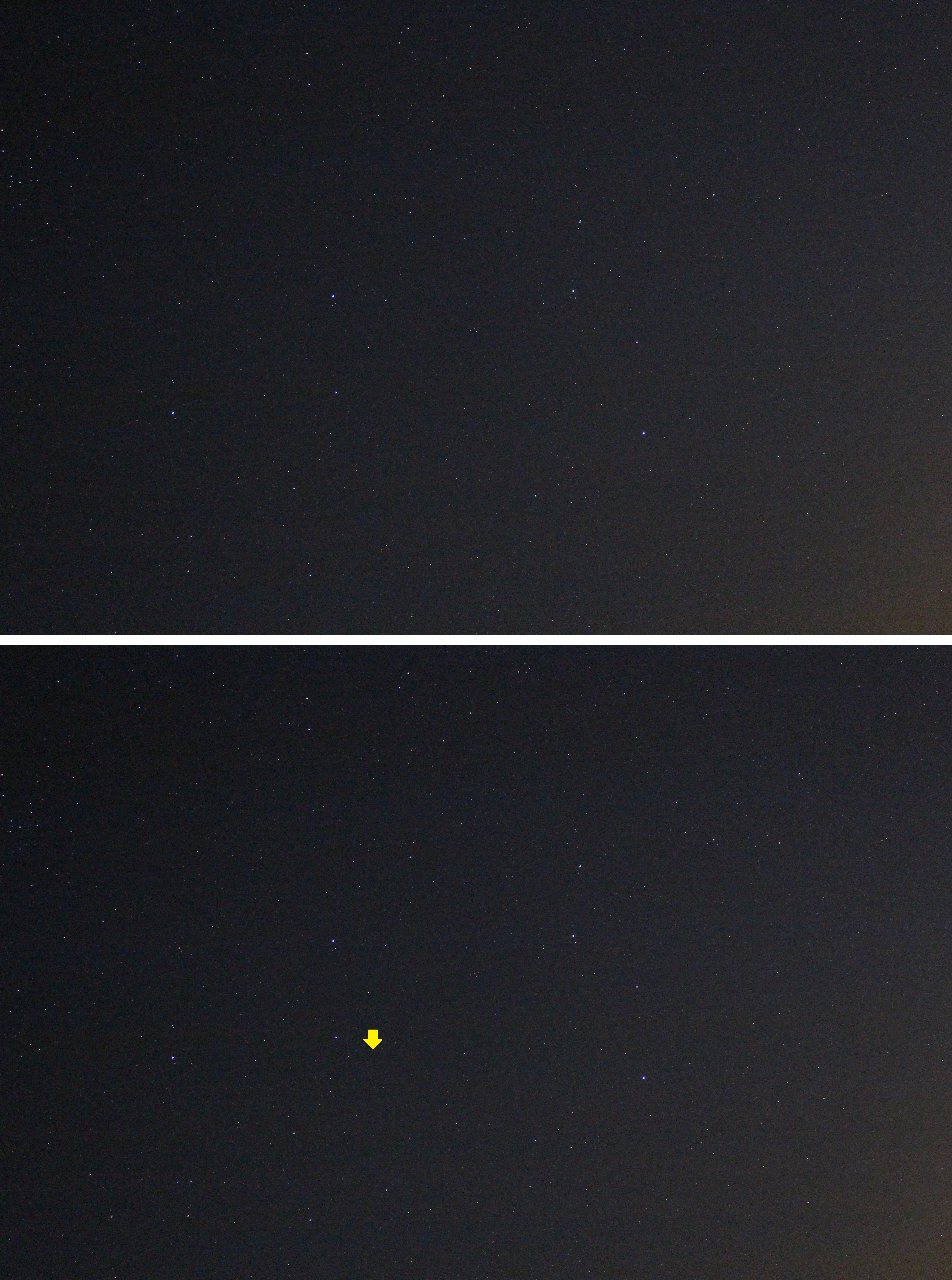 Das Sternbild Löwe mit Kleinplanet Vesta, aufgenommen am Abend des 8. Mai 2021. Auf dem unteren Bild, das zur gleichen Zeit mit dem gleichen Belichtungsparametern wie das obere Bild aufgenommen wurde und das auch den gleichen Himmelsausschnitt zeigt, ist der Kleinplanet Vesta mit einem gelben Pfeil markiert.