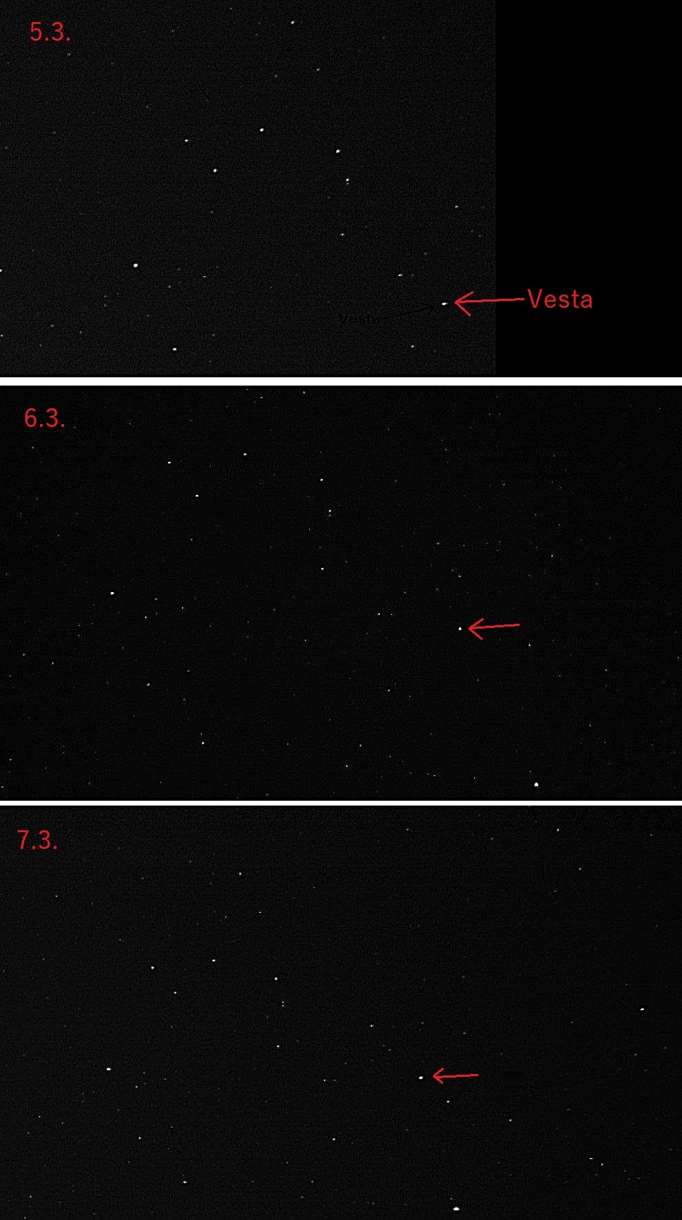 Drei klare Nächte in Folge und Kleinplanet Vesta besonders hell zur Zeit. Da war Anlass, die Vesta bei ihrer Bewegung vor den Sternen zu beobachten und dieses Komposit zu erstellen.