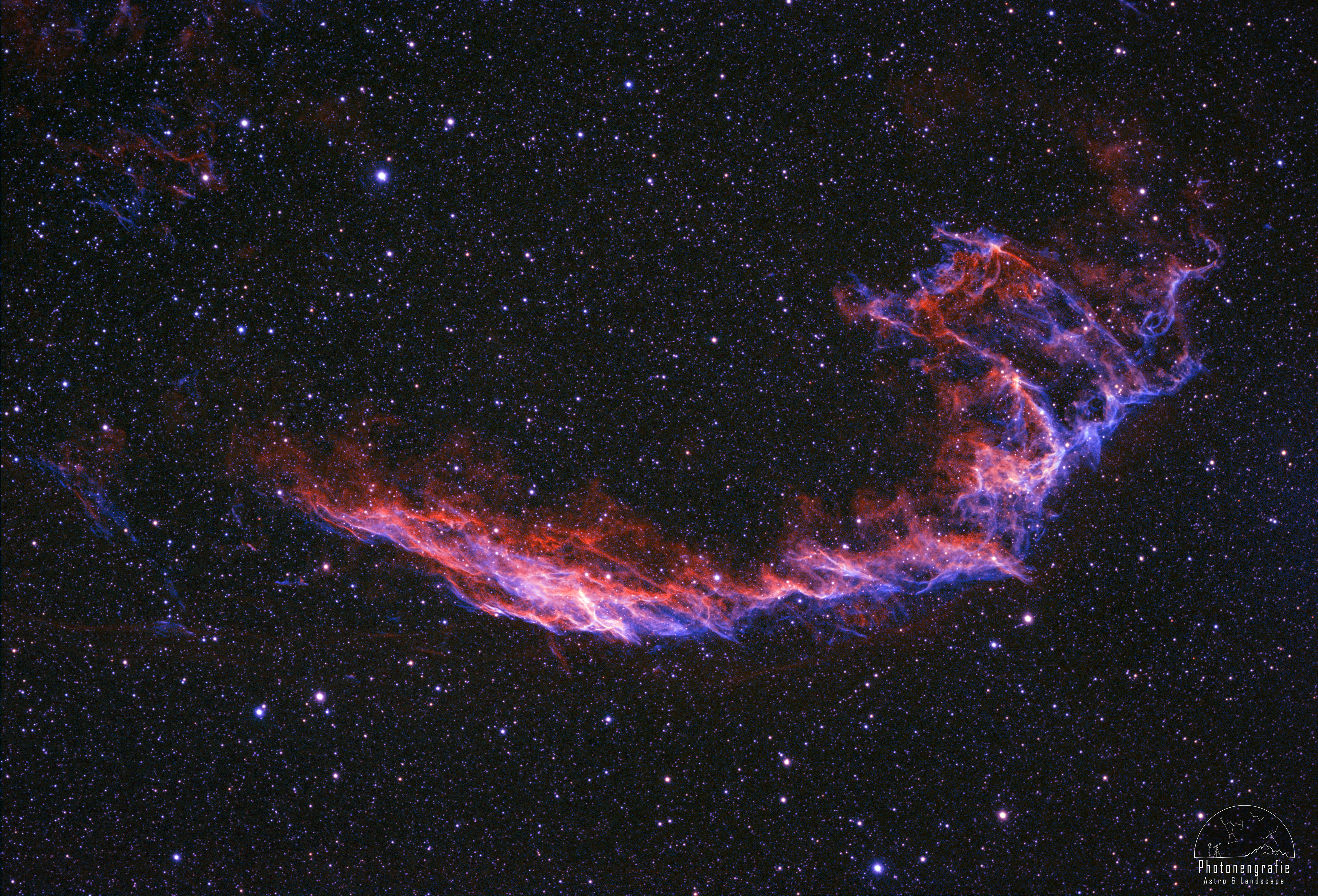 Der Knochenhandnebel oder NGC 6960 im Sternbild Schwan. Dieses Bild ist für mich deshalb sehr besonders, weil es zum einen um den Vollmond entstanden ist und zum anderen noch aus der Stadt heraus im Rhein-Main-Gebiet. Es ist toll zu sehen, was trotz Lichtverschmutzung und Mond noch möglich ist. Bei diesem Objekt kommt einem natürlich zu gute, dass es sehr hell ist.