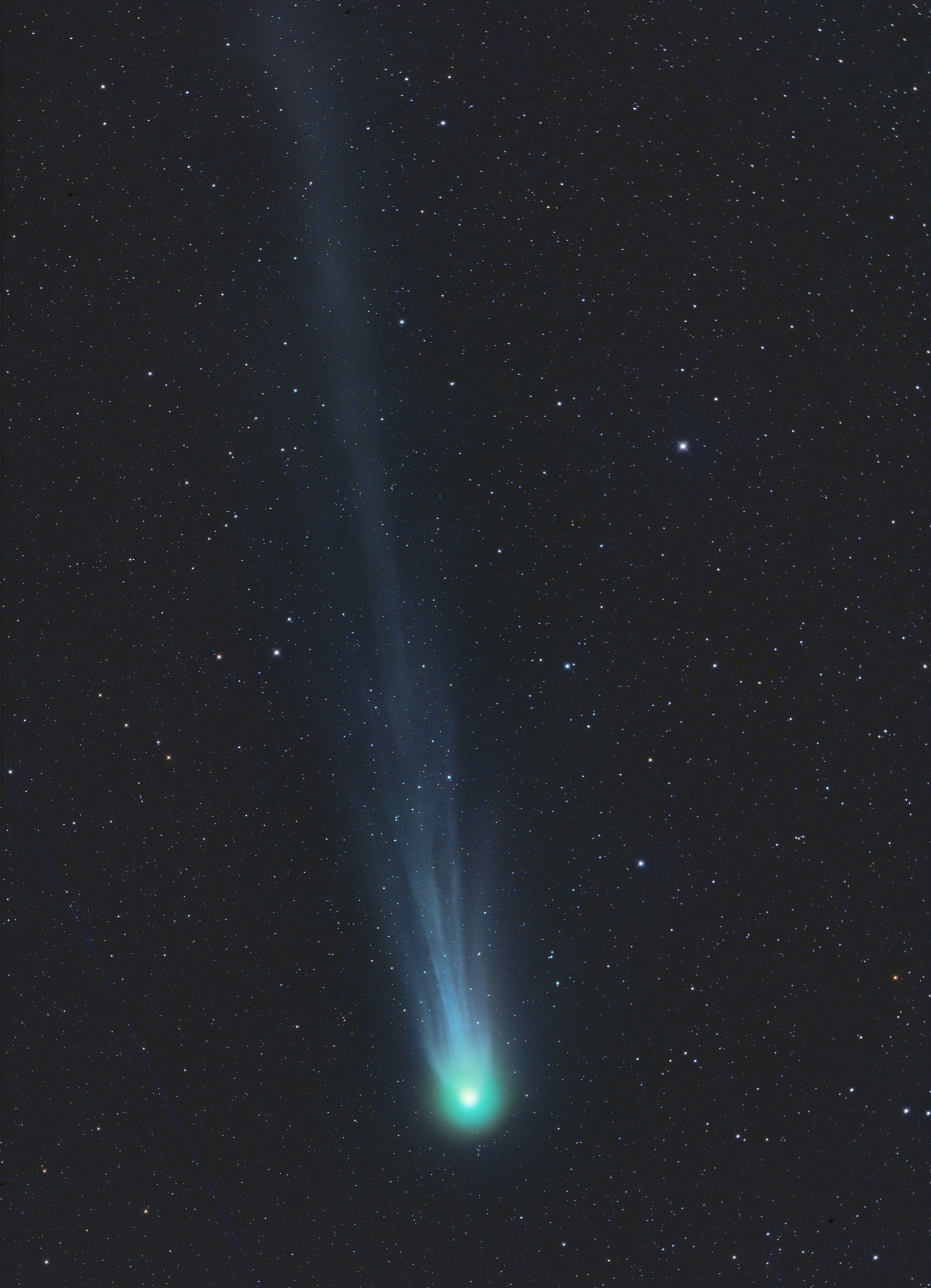 Nach seinem abermaligen Helligkeitsausbruch vom 29. Februar zeigt der Komet einen Tag später wunderschöne Schweifstrukturen. Diese Übersichtsaufnahme zeigt den Schweif über 2,5 Grad