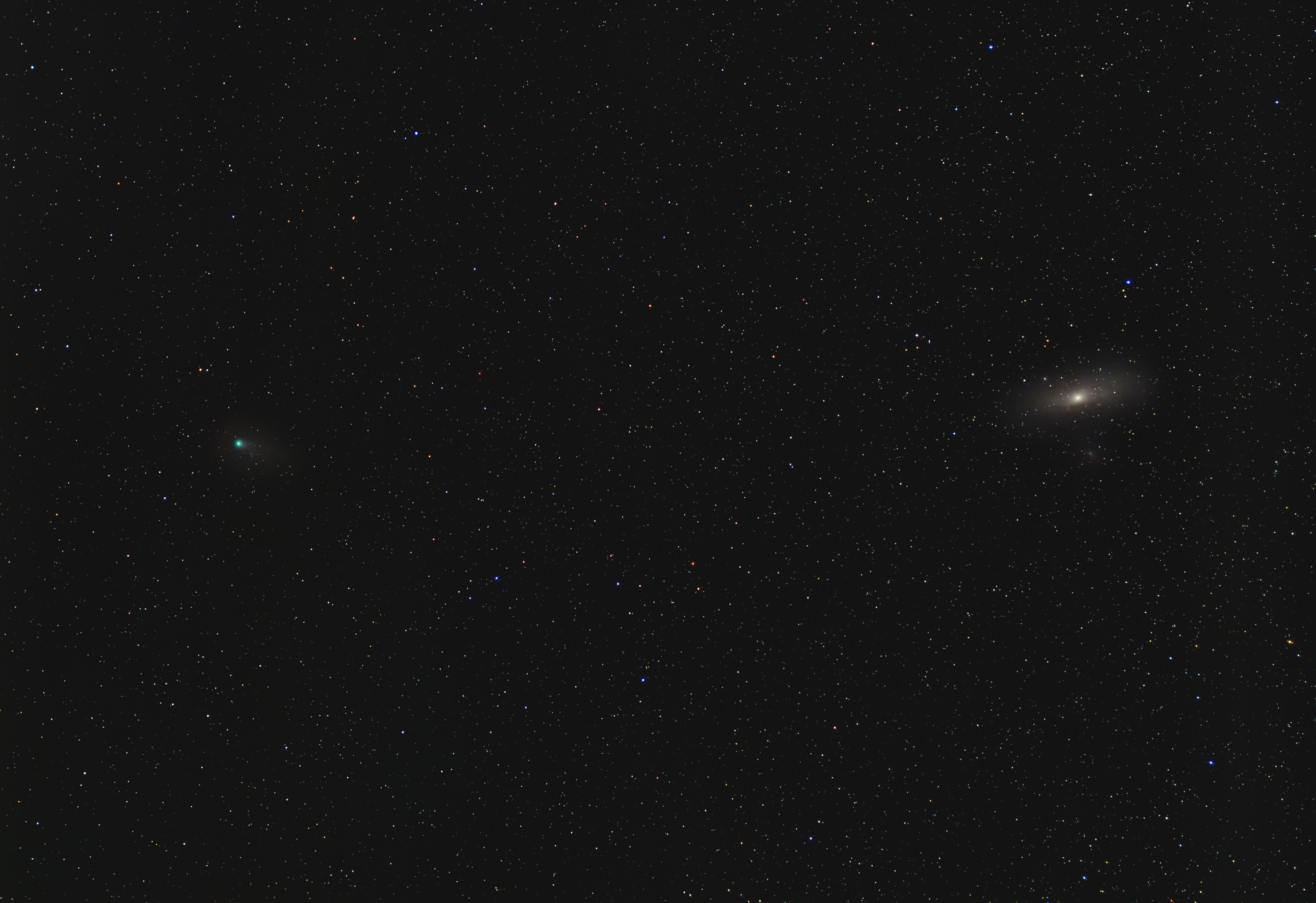 Komet Pons-Brooks in der Nähe der Andromeda-Galaxie Messier 31 am 8. März 2024. Da der Komet gegen 20:30 Uhr bereits in Horizontnähe liegt, waren nur 15 Sekunden Belichtungszeit pro Bild möglich. Die Lichtglocke der Stadt hätte mit längeren Belichtungszeiten die Details untergehen lassen.