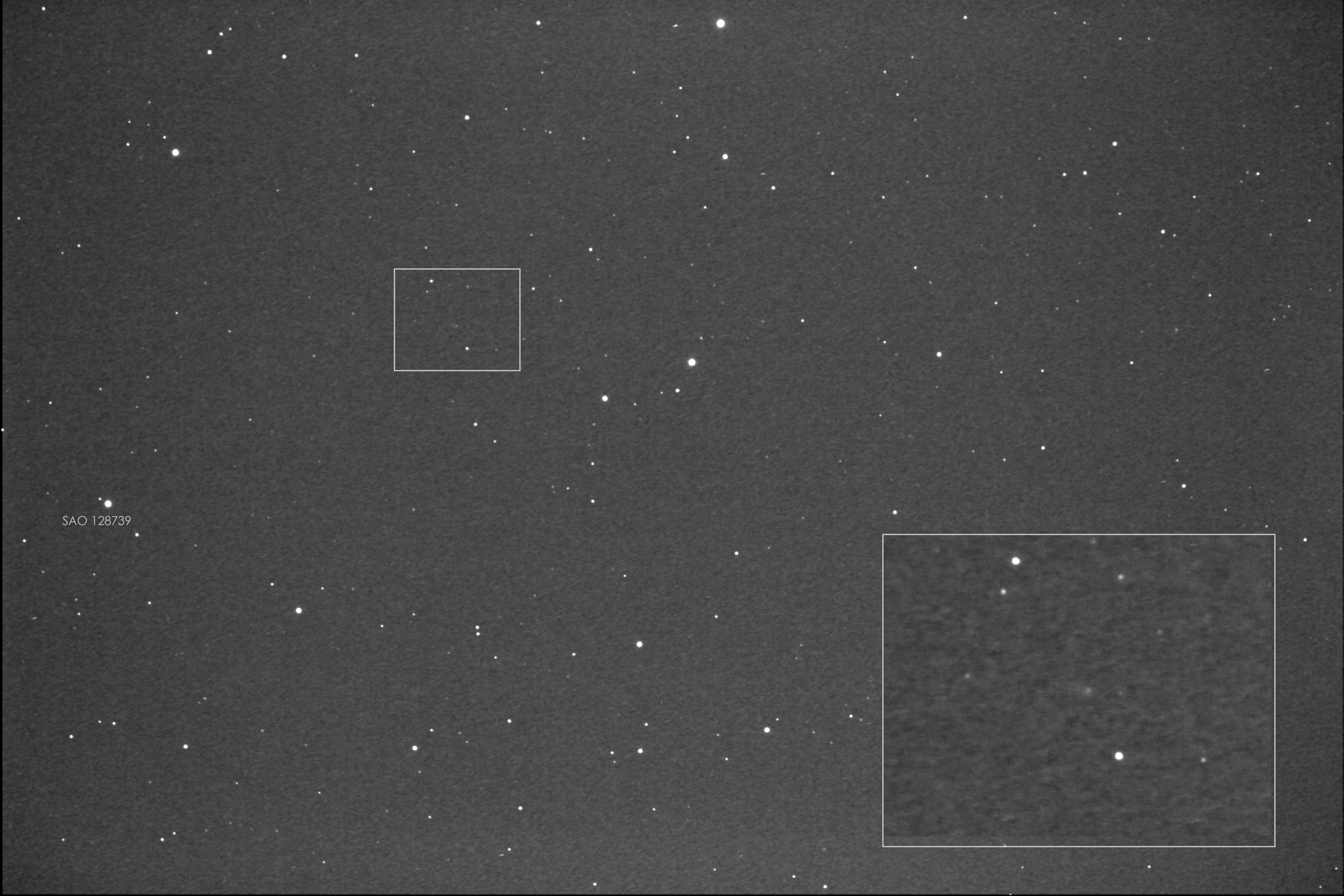 Komet P132 Helin-Roman-Alu-2 wandert zur Zeit im Sternbild der Fische und dies beflügelte mich, meine Angel auszuwerfen. Ein sehr kleiner »Fisch«, denn mit 15 mag mit einem Refraktor 102/800 und meiner Canon waren die Chancen gering, doch ein Fischer ist meistens auch ein Optimist. Mitten in der Kleinstadt, der Mond war auch noch unweit am Himmel, und aus der eigentlich praktischen Speichersternwarte wurde nun 30 mal je 30 Sekunden belichtet. Auf den ersten Rohbildern hinten auf dem Display der Canon war er überhaupt nicht zu erkennen. Am folgenden Tag konnte ich auf meinem Laptop zuerst auch nichts bemerken, doch als ich das letzte und erste Bild stark schärfte, und im Hopping-Verfahren beäugelte, fiel mir der niedlich kleine »Seitensprung« auf. Wahrlich, kein Bild, um einen Wettbewerb zu gewinnen, doch für mich eine große Genugtuung, ihn trotzdem gefischt zu haben.
