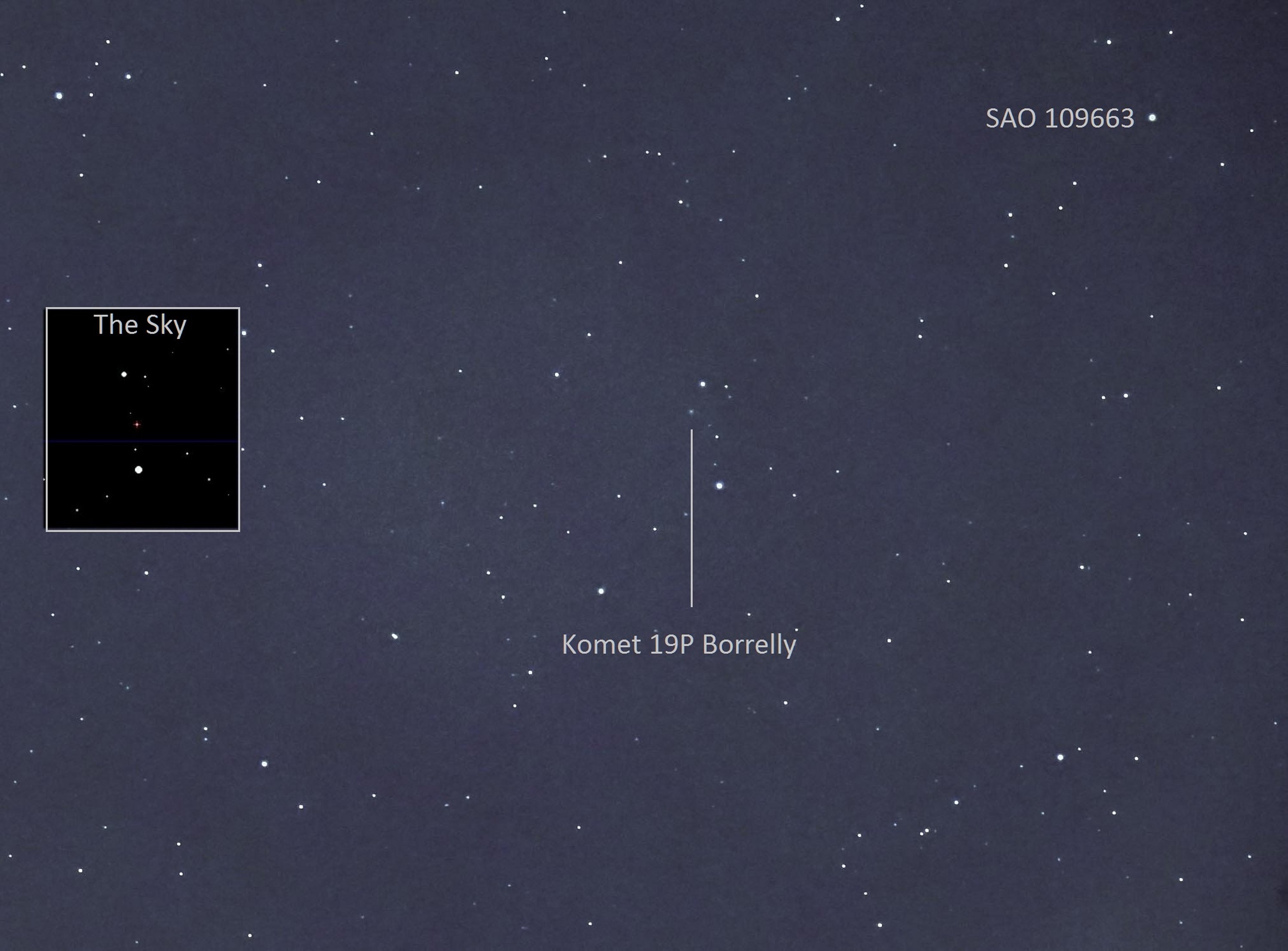 Mit absoluter Sicherheit nicht das «Picture of the Day», aber dennoch interessant, wenn ich den minimalen Aufwand betrachte. Der mit Wolken bedeckte Himmel erlaubte mir gegen 21:30 Uhr lediglich fünf Bilder zu je zehn Sekunden bei ISO 10000 in Richtung des Kometen 19P/Borrelly zu machen, dann war Schluss. Er befindet sich derzeit im Sternbild Cetus ( Walfisch). Und nun sah ich den Kometen zu meinem Erstaunen nach dem Stacken in IRIS deutlich. Die geschätzte Helligkeit lag bei 12,16 mag. Die Entfernung des Kometen 19P/Borrelly von der Erde betrug am 24. Januar etwa 186 Millionen Kilometer, was 1,24 Astronomischen Einheiten entspricht. Das Licht brauchte 10 Minuten und 22 Sekunden, um vom Kometen zu uns zu gelangen. Mit 50 Sekunden Belichtungszeit war er nun doch in der Kiste. Nun ja, in der Not frisst der Teufel Fliegen. Hier ist so eine !