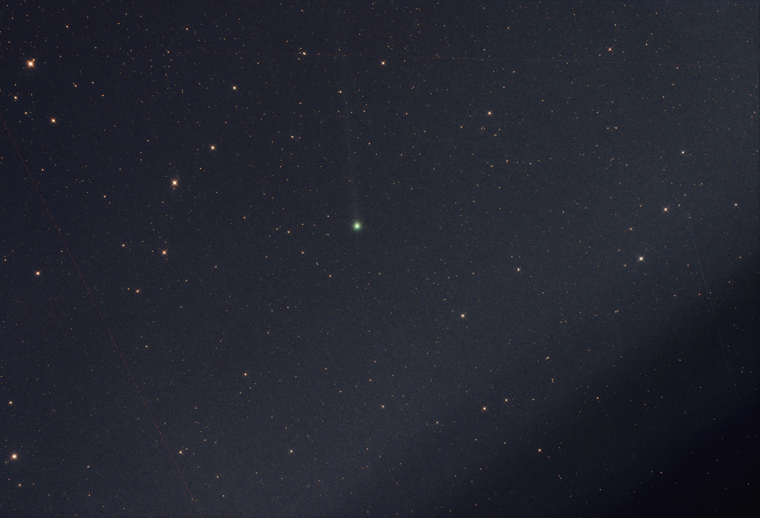 Der Komet stand zur Zeit der Aufnahme rund neun Grad über dem Horizont, den man rechts unten sehen kann. Leider zogen nach der ersten Aufnahme Wolken auf und so blieb es bei diesem Erinnerungsbild mit sehr kurzer Belichtungszeit.