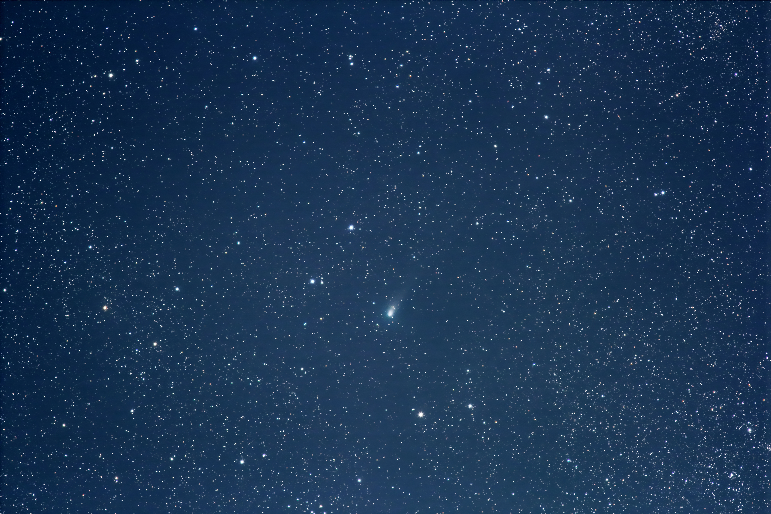 Komet Giacobini-Zinner in der Kassiopeia, nach einem sehr heißen Sommertag. Nur ganz leichte Bewölkung. Stehe in der Wiese mit meinem Stativ mit Star-Adventurer-Montierung und Canon-300-mm-Tele und warte, bis es endlich mal einigermaßen finster wird.