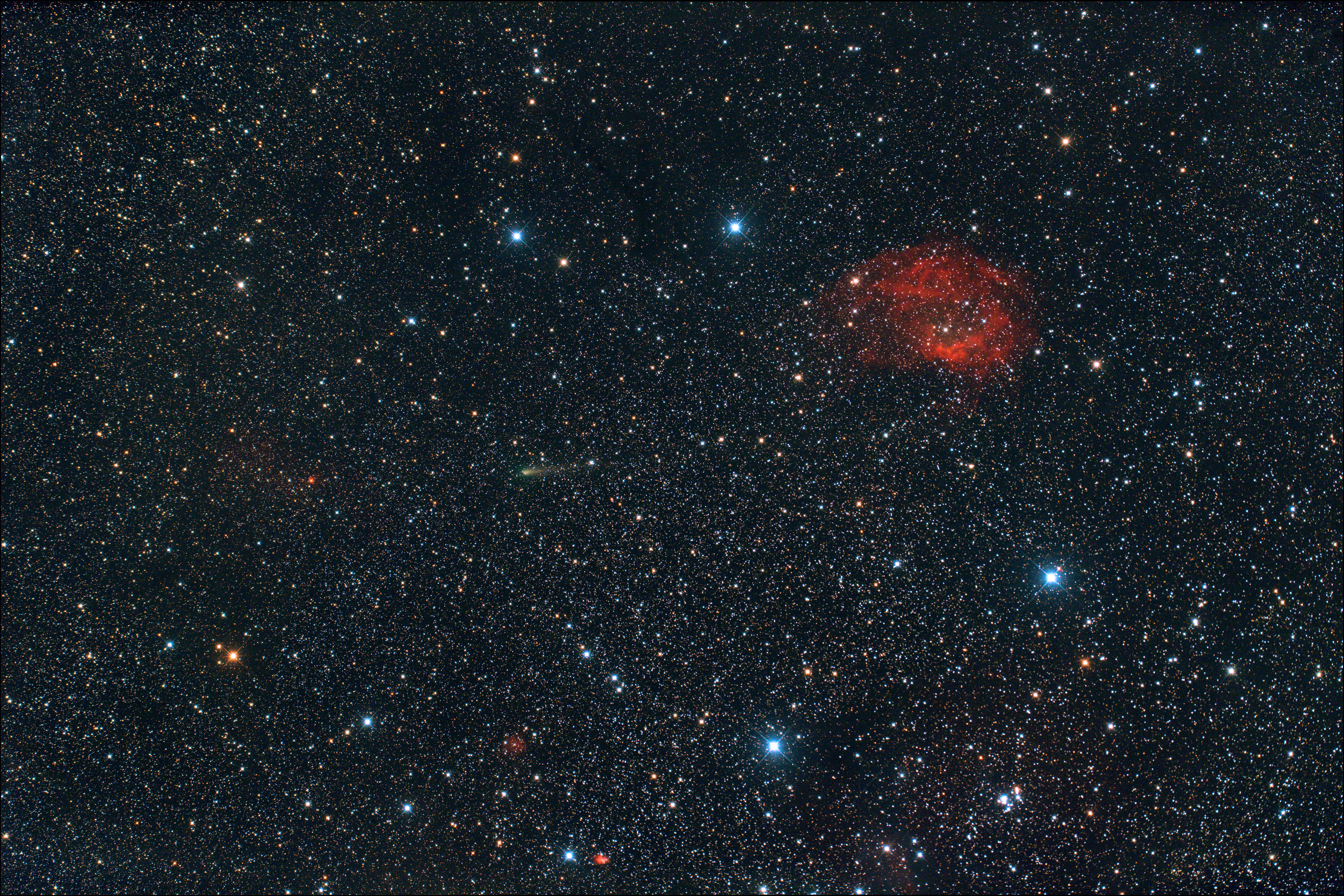Es war endlich wieder eine sternenklare Nacht nach einer längeren sternlosen Zeit. Nach Mitternacht konnte man bereits gut die Kometen fotografieren. Einer davon ist der 4P Faye - aktuell im Orion und in der Nähe eines malerischen Nebels SH2-261, auch als "Lowers Nebula" bekannt.