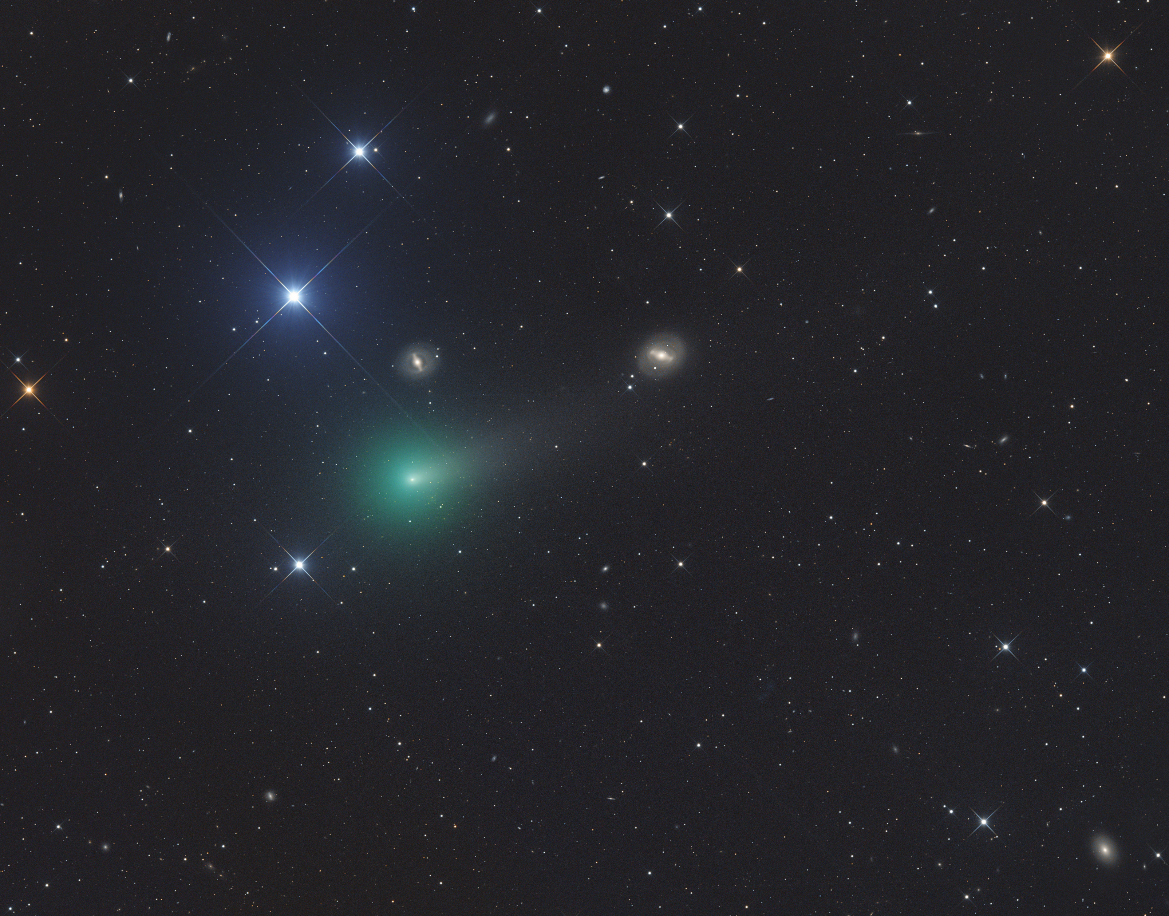 Auf seinem Weg entlang des Virgo-Galaxienhaufens begegnet der Komet um unzähligen Galaxien. In diesem Bild den hellen Galaxien NGC 4596 und NGC 4608.