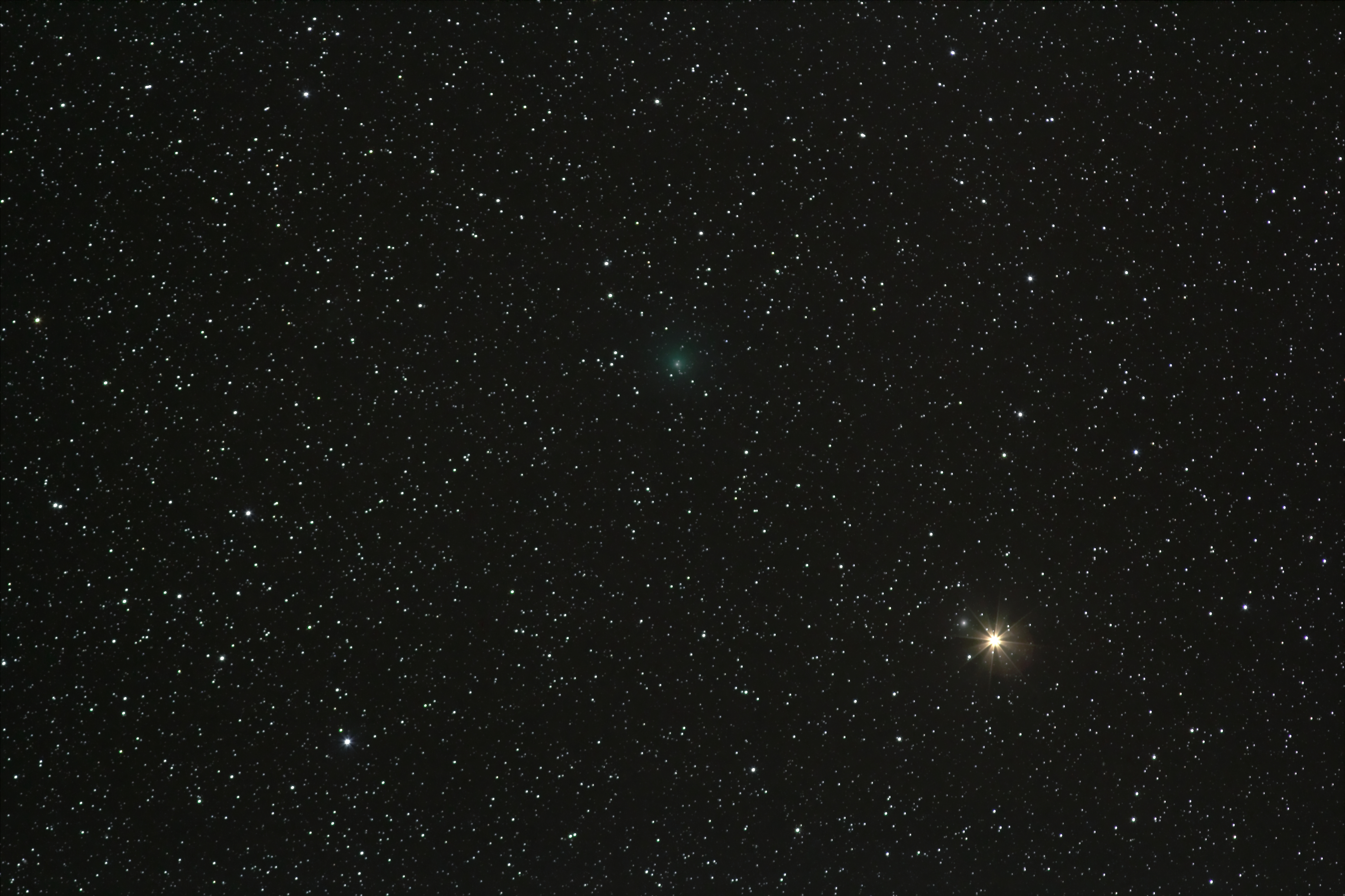 Endlich hat sich der Nebel verzogen und ich konnte wieder einen der wiederkehrenden Kometen ins Visier nehmen: In der Andromeda (oberhalb von Mirach und Mirachs Geist) der Komet 64P/Swift-Gehrels, der alle neun Jahre wieder in Sonnennähe (Marsbahn) kommt.