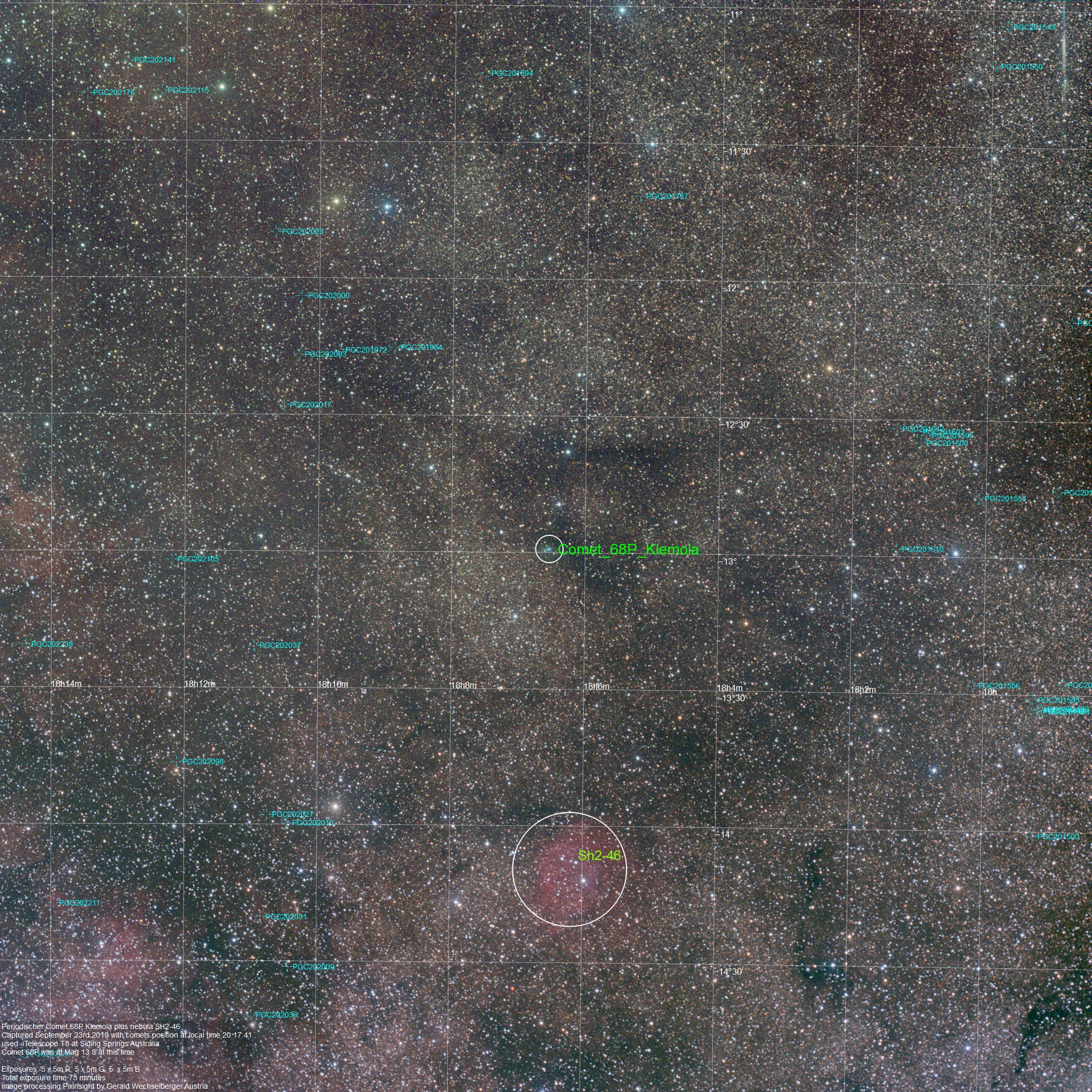 68P came to opposition on 14 June 2019 and will come to perihelion on November 9, 2019. In this image the comet is in the center of the image at RA 18:06:32 and DEC -12:59:15 Brightness approx Magnitude 13.8