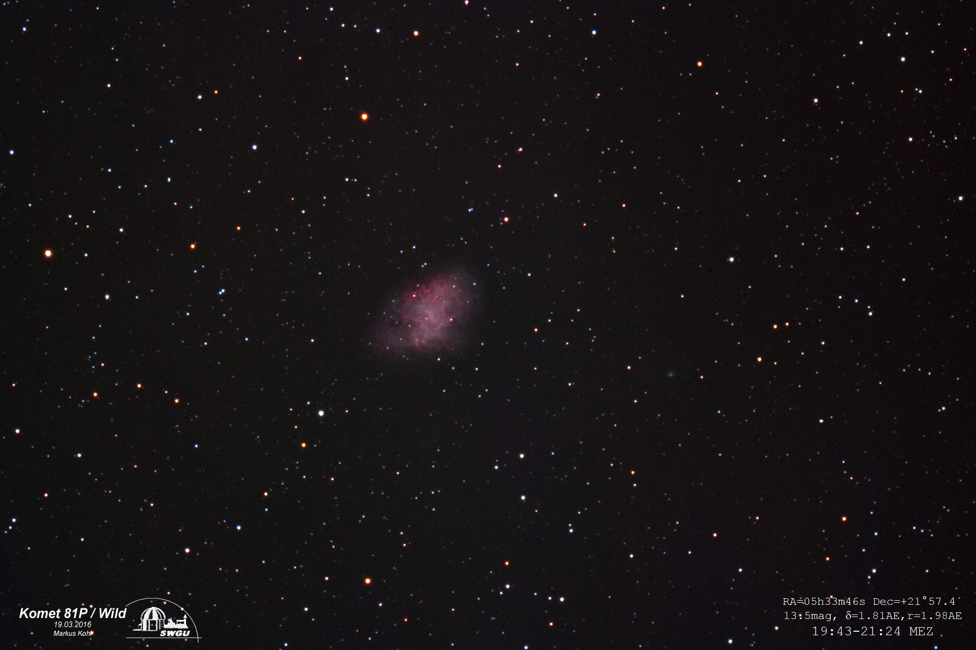Am Samstag, dem 19. März 2016, bei hellem Mondschein aber sonst guter Sicht konnte ich den 13,5 mag schwachen Kometen 81P/Wild nahe Messier 1 mit dem tragbaren Esprit 150 unserer Sternwarte (www.swgu.de) aufnehmen. Bei 24 Aufnahmen ISO 800, je 150 Sekunden belichtet, musste ich bei der Bearbeitung den Kometen an einer Position "einfrieren". Kamera war eine Canon EOS 60d ohne IR-Sperrfilter. Ich habe mit dem ersten und letzten Bild eine Winkelbewegung von 22 Bogensekunden pro Stunde berechnet. Am Sonntag, dem 20. März, in den Vormittagsstunden wäre dieser kleine Komet direkt an M1 vorbeigewandert.