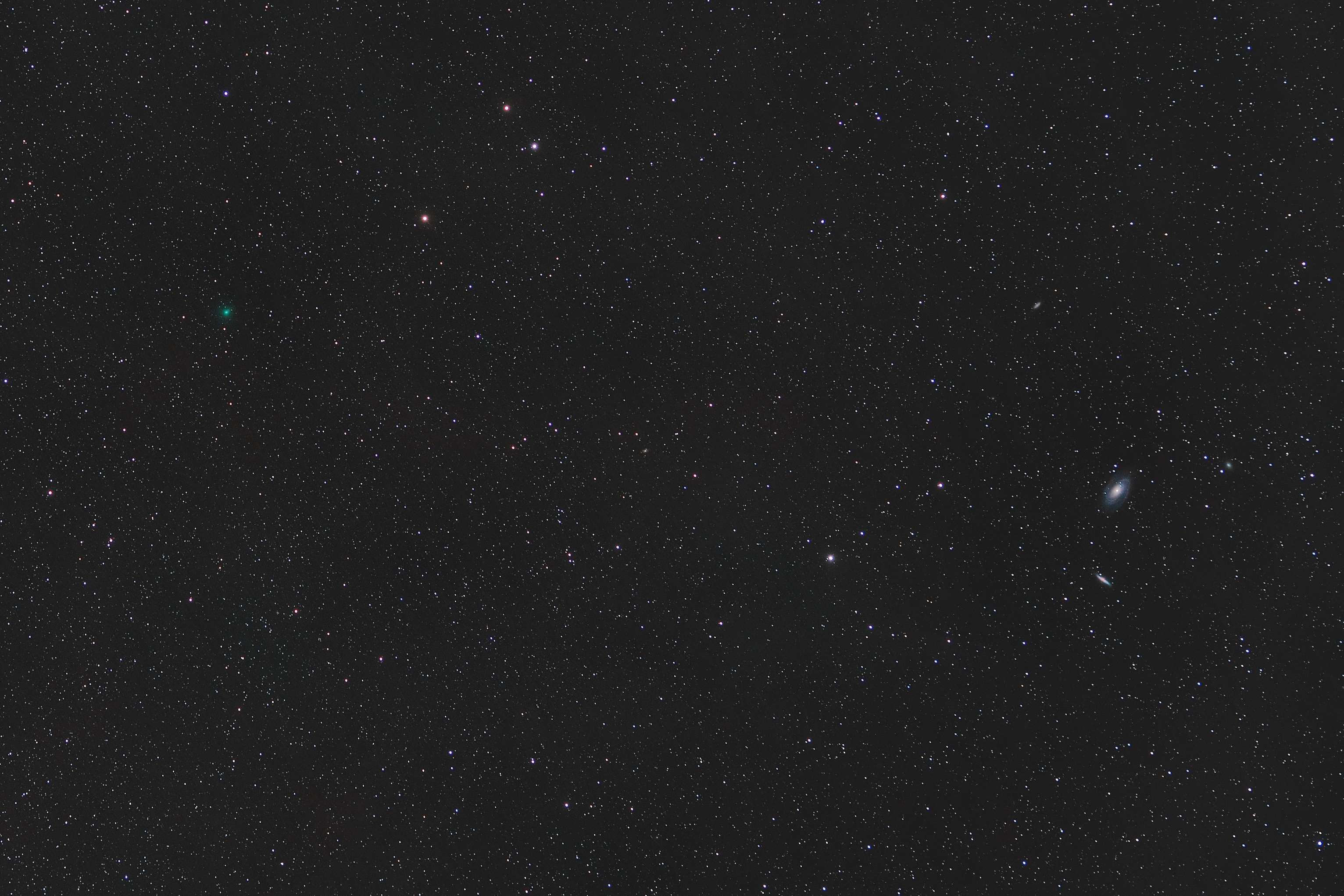 Am 24. März 2020 zog Komet Atlas unweit der beiden Galaxien M 81 und M 82 durch den Grossen Bären. Ein Schweif war an diesem Abend noch nicht auszumachen, aber bereits die für Kometen typische gründliche Färbung.