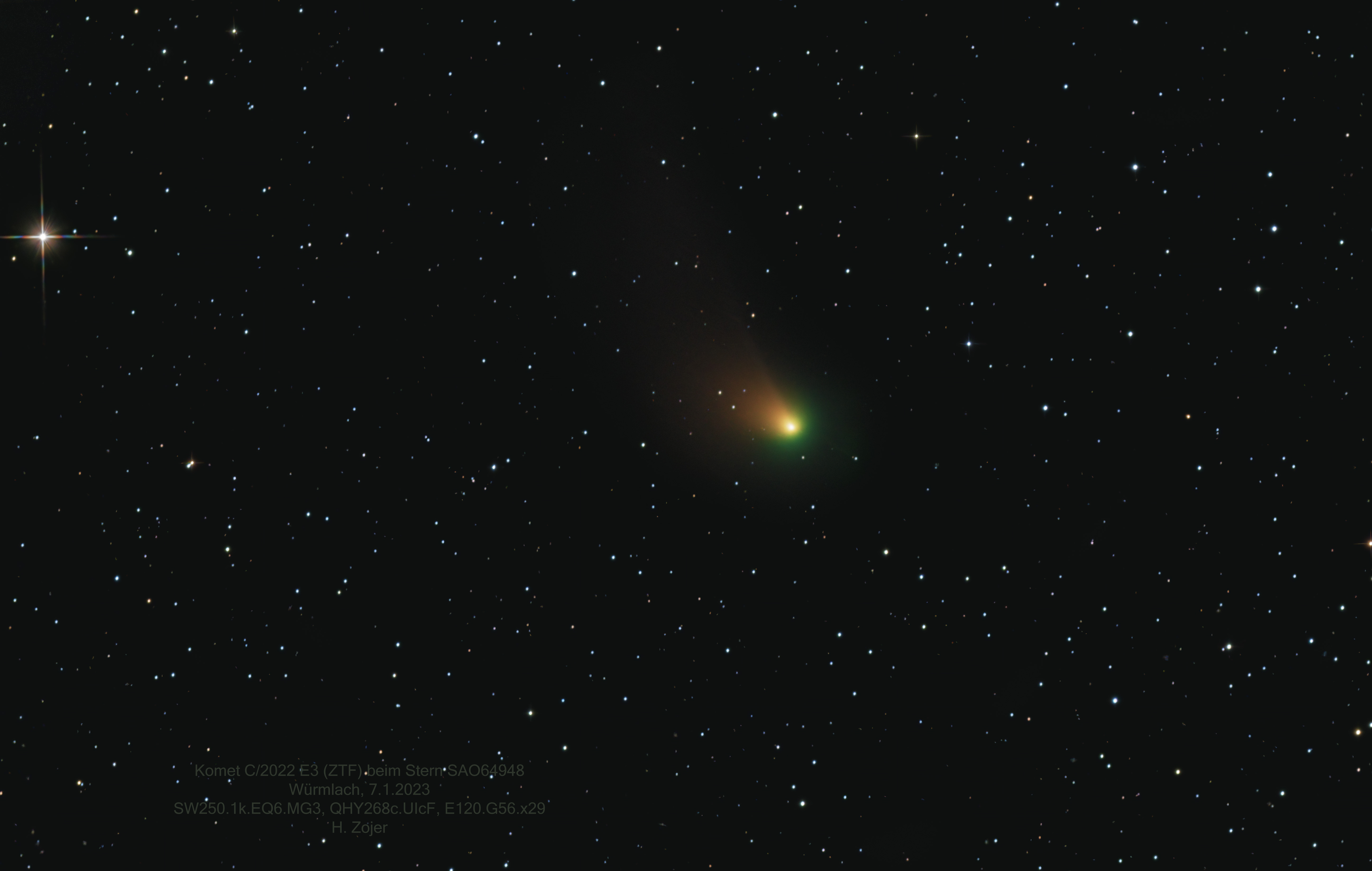 Die Vollmondnacht in Kärnten war ausgezeichnet von einem relativ klaren Himmel. Diese Gegebenheiten veranlassten mich, das Teleskop am Kometen C/2022 E3 (ZTF) auszurichten und ein paar Aufnahmen zu machen. Die rötliche Färbung des Kometenschweifs ist vermutlich dem Vollmondlicht und zartem Bodennebel geschuldet.