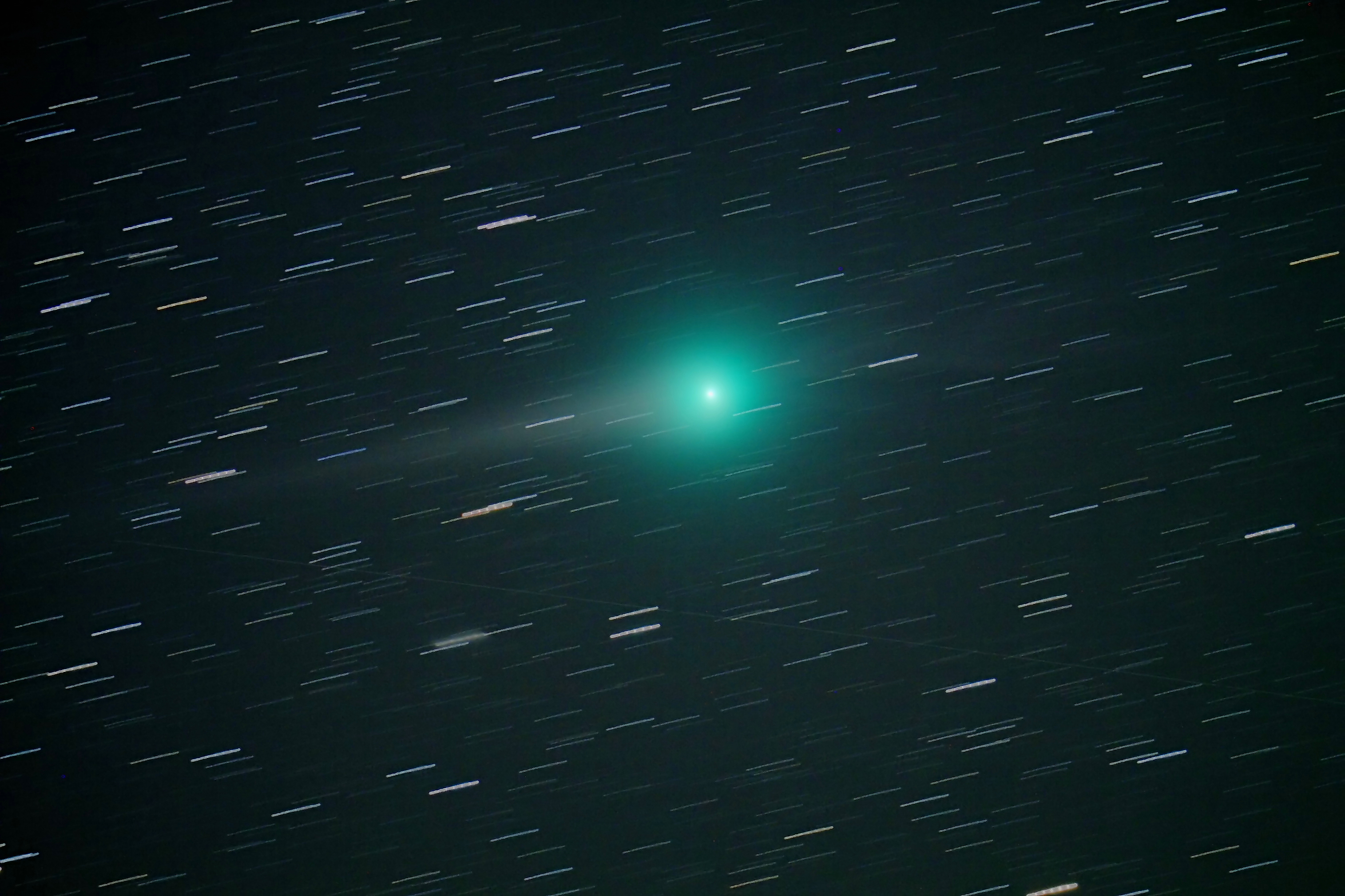 Unter dem Ionenschweif ist als diffuser Strich NGC 4546 und eine Satelitenspur zu erkennen.