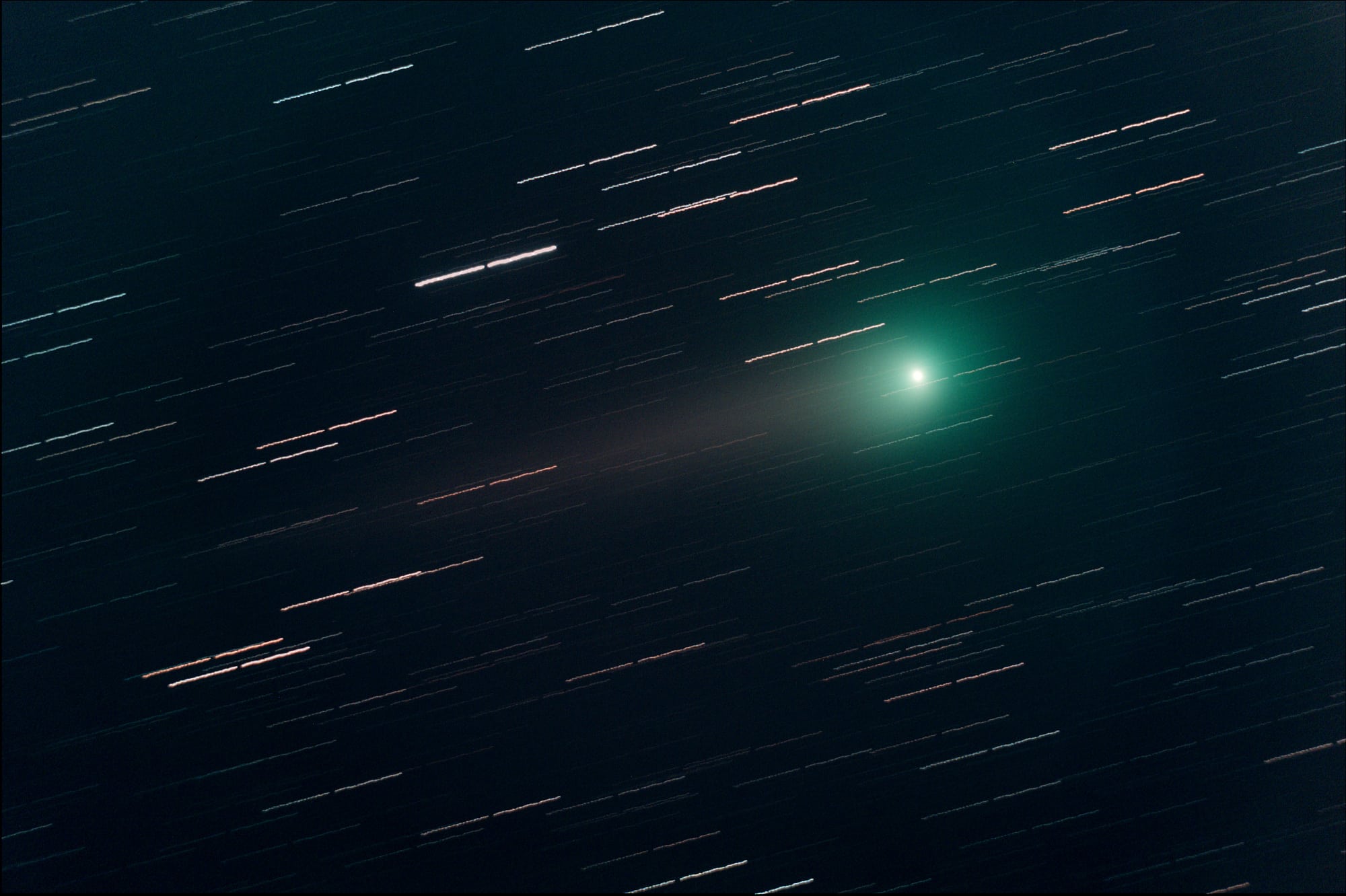 6 Aufnahmen wurden je 10 Minuten lang belichtet und mittels Autoguider am Kometen nachgeführt. Die Aufnahmen wurden dann addiert. An den langen Strichspuren der Sterne kann man deutlich die große Eigenbewegung des Kometen innerhalb einer Stunde erkennen.