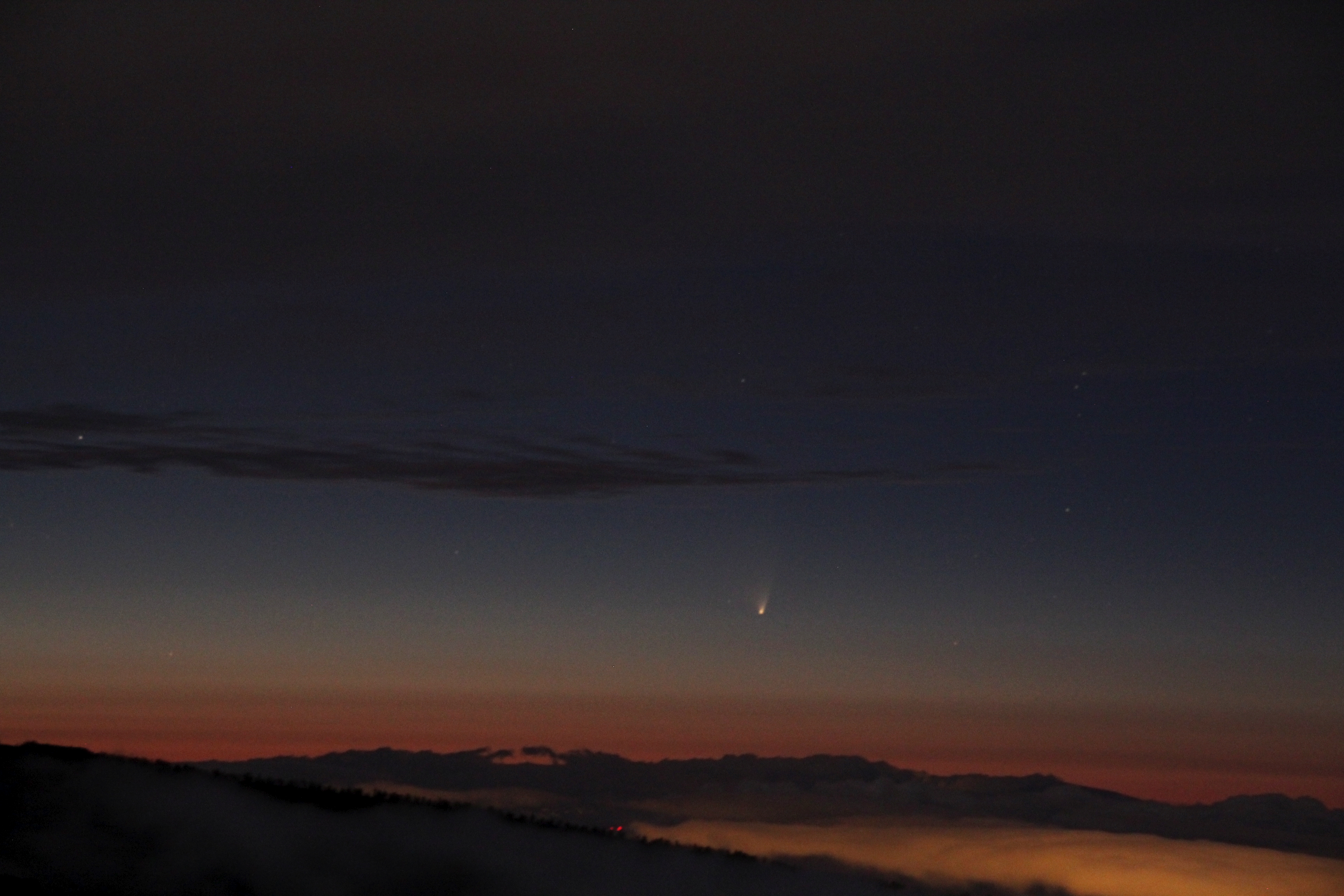 Vom 9.3.2013 an versuchte ich, den Kometen zu erwischen, doch immer wieder schoben sich Wolken vor den Westhorizont. Am 18.3. hatte ich endlich Glück. Ich stand auf 2400 m Höhe auf Teneriffa, der Komet war nur innerhalb eines schmalen Fensters von 20:00 bis 20:30 Uhr UT sichtbar und ging direkt über der Nachbarinsel La Palma unter. Mit bloßem Auge war er kaum sichtbar, mit dem Fernglas sofort.