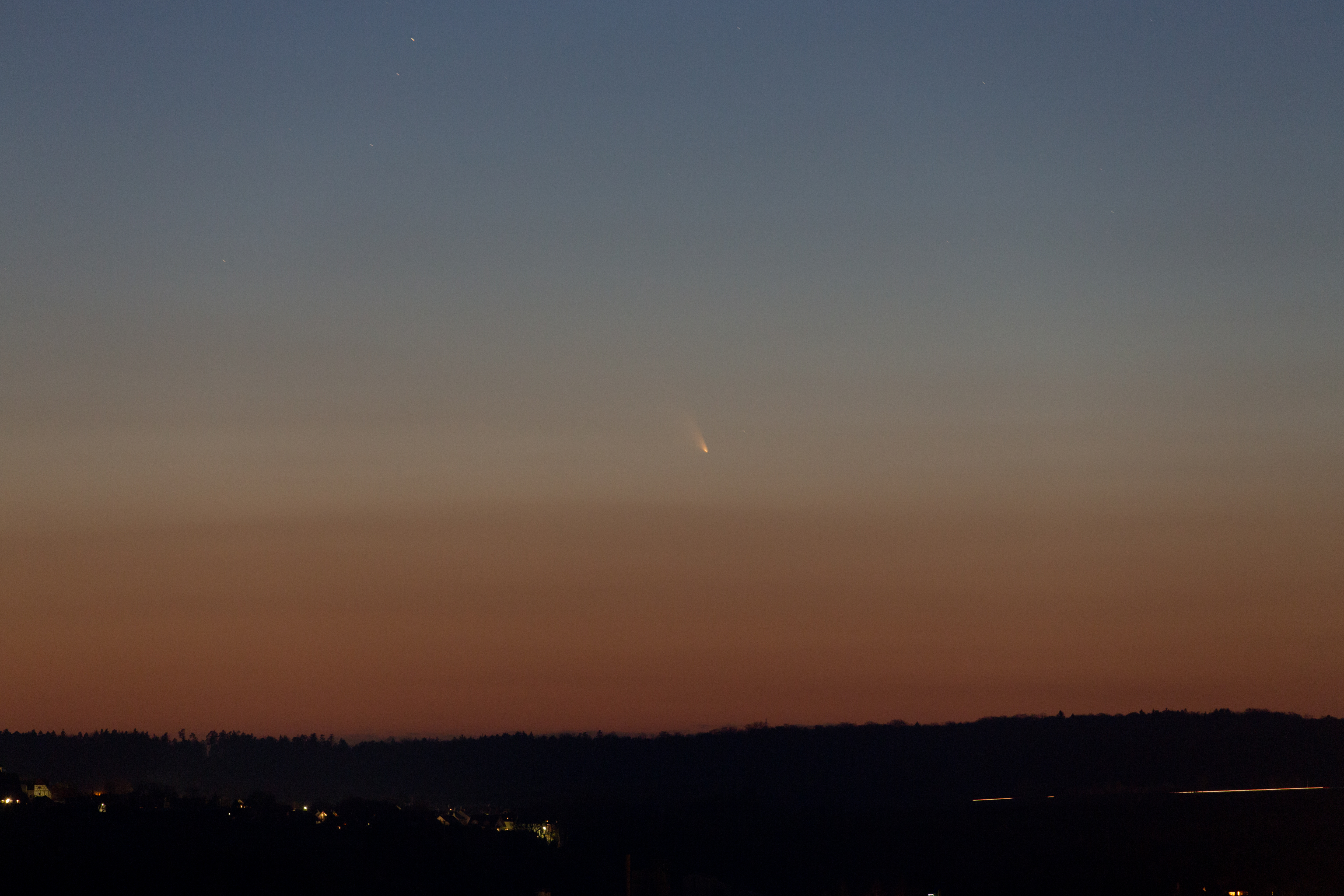 Tagsüber hat es noch geschneit, aber gegen Abend wurde es klar. Daher bot sich die Chance Komet PANSTARRS zu fotografieren. Die Aufnahme entstand auf freiem Feld nahe meines Wohnorts Herrenberg-Gültstein.