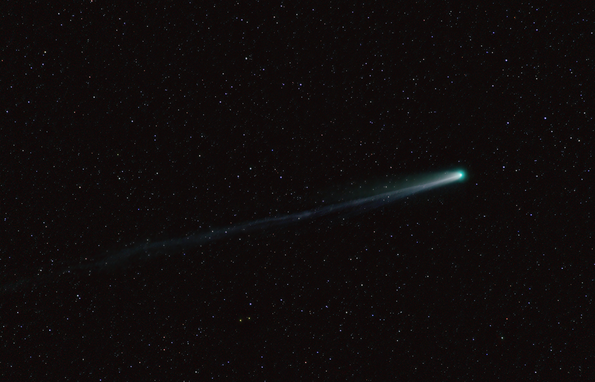 Nach langer Zeit kann ich auch mal wieder ein Bildchen präsentieren. Es ist der Komet Lovejoy am Morgen des 13. Dezember 2013. Um 04:00 Uhr habe ich auf dem Feld meine Reisemontierung aufgebaut (das war first light der selbigen) und die EOS 5D mk2 samt 300-Millimeter-EF-L-Objektiv darauf geschnallt. Belichtet habe ich bis zur Dämmerung 25 x 90 s bei ISO 800.