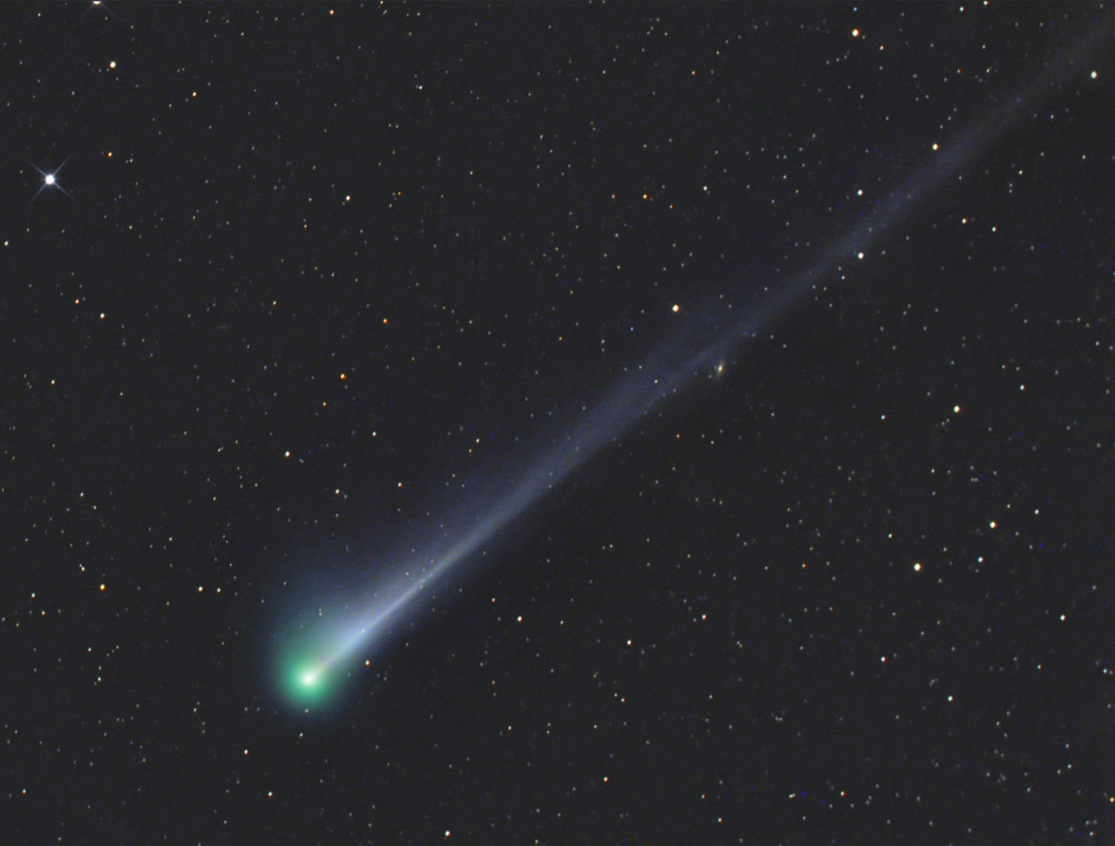 Die Aufnahme entstand zwei Tage nach dem Perihel des Kometen per Fernsteuerung. Streulicht von Mond und Dämmerung erschwerten die nachfolgende Bildbearbeitung sehr.