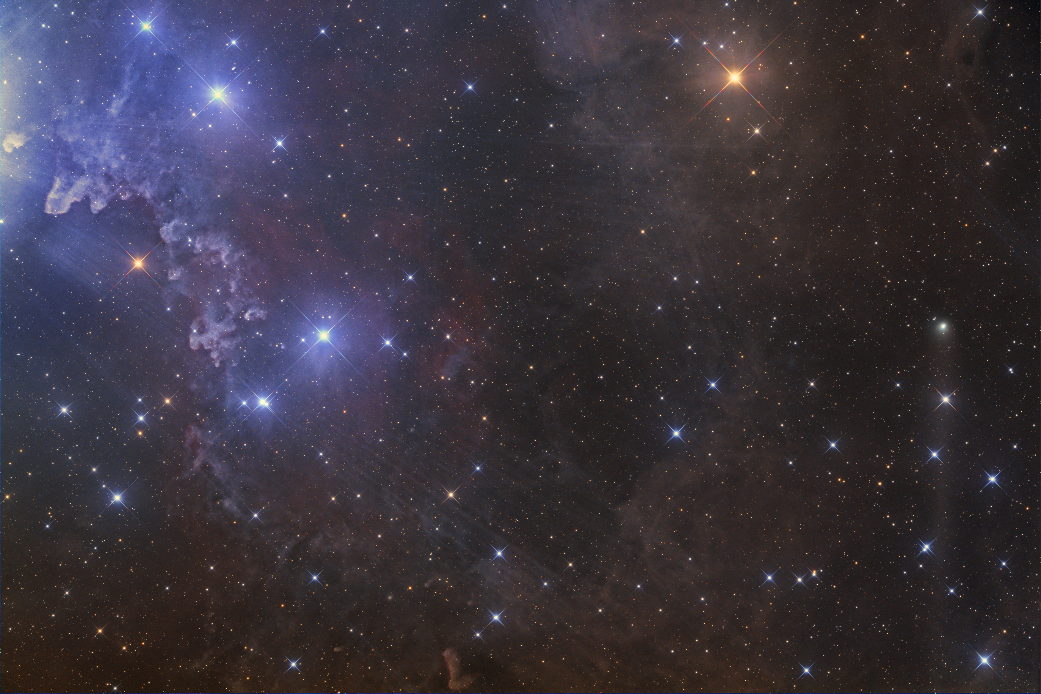 Der Komet wandert durch das Sternbild Orion und ist hier in der nebeligen Umgebung der Gürtelsterne zu sehen.