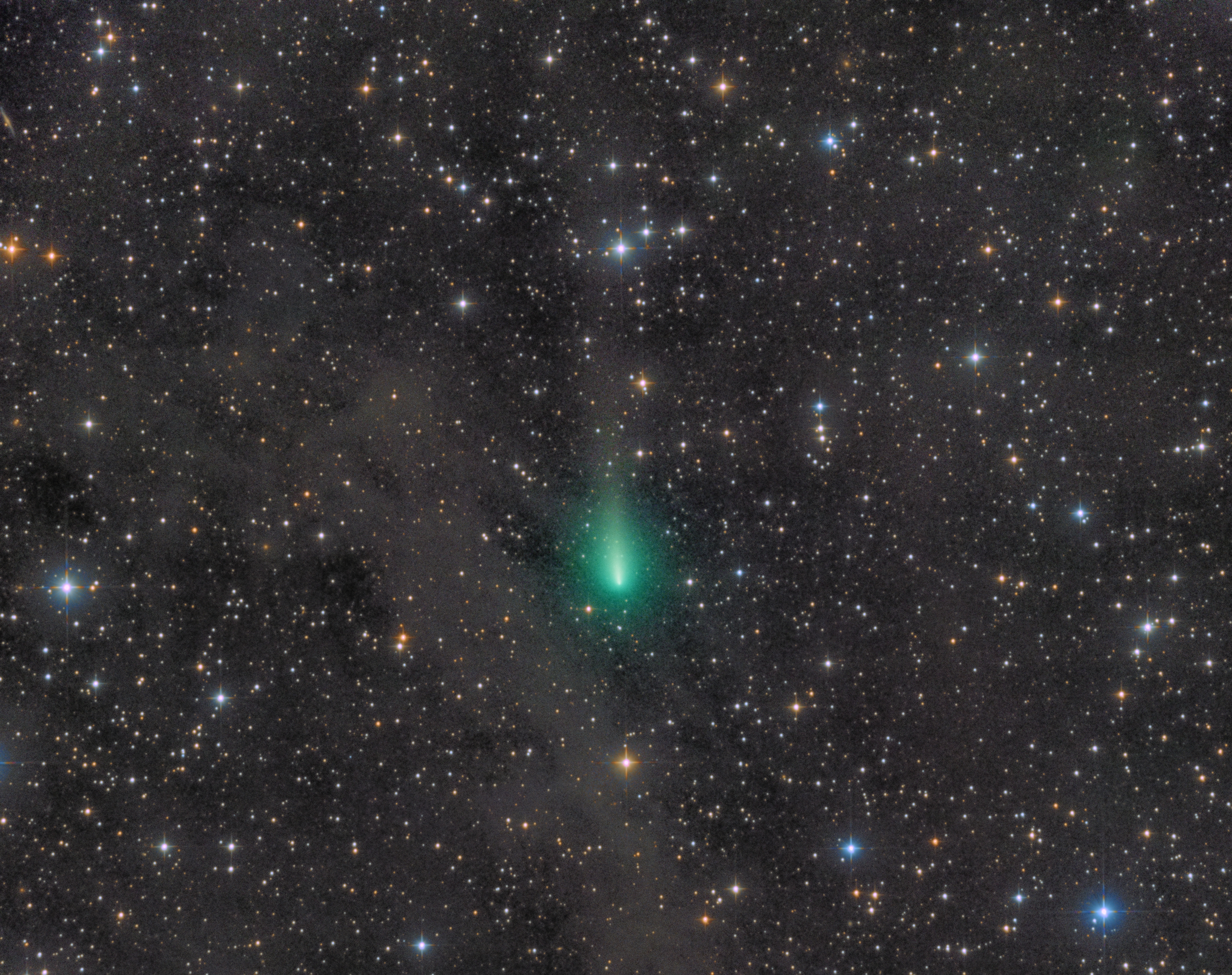 Aufnahme des Kometen C/2019 Y4 ATLAS am 11. April 2020. Für den Kometen wurden 24 x 4 Minuten, für den Hintergrund 98 x 5 Minuten und 33 x 10 Minuten aufgenommen.