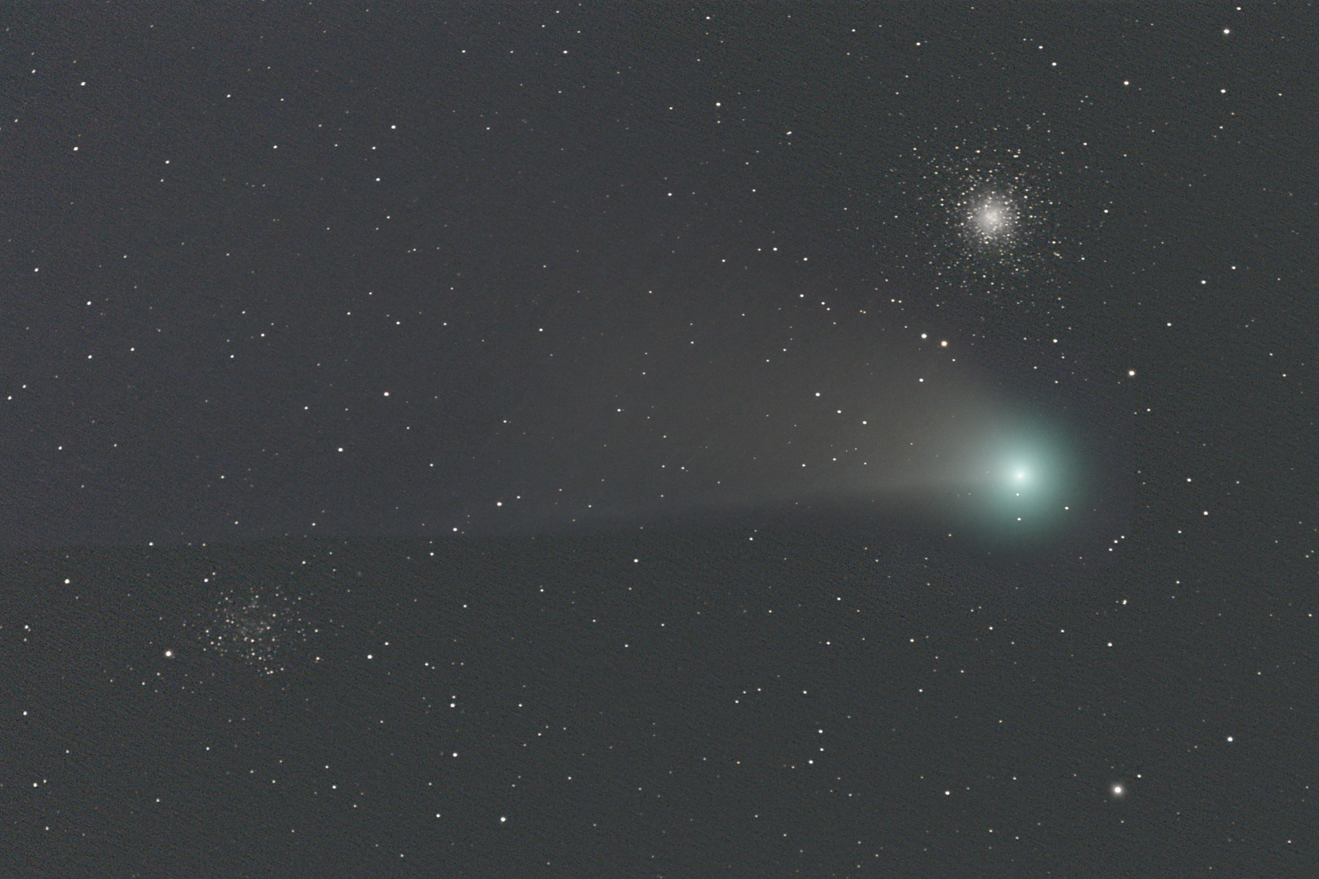 Den Besuch des Kometen bei den beiden Kugelsternhaufen Messier 53 (oben) und NGC 5053 (links unten) wollte ich mir nicht entgehen lassen. Bei meinen Aufnahmen stand er nur zwischen 20,8 und 14,4 Grad über dem Horizont. Und der 90%-Mond störte natürlich. Die 24 Aufnahmen wurden mit DeepSkyStacker auf das Referenzbild um 22h42 MESZ ausgerichtet. Der Komet war von der Sonne 142,2 Millionen Kilometer und von uns 139,7 Millionen Kilometer entfernt.