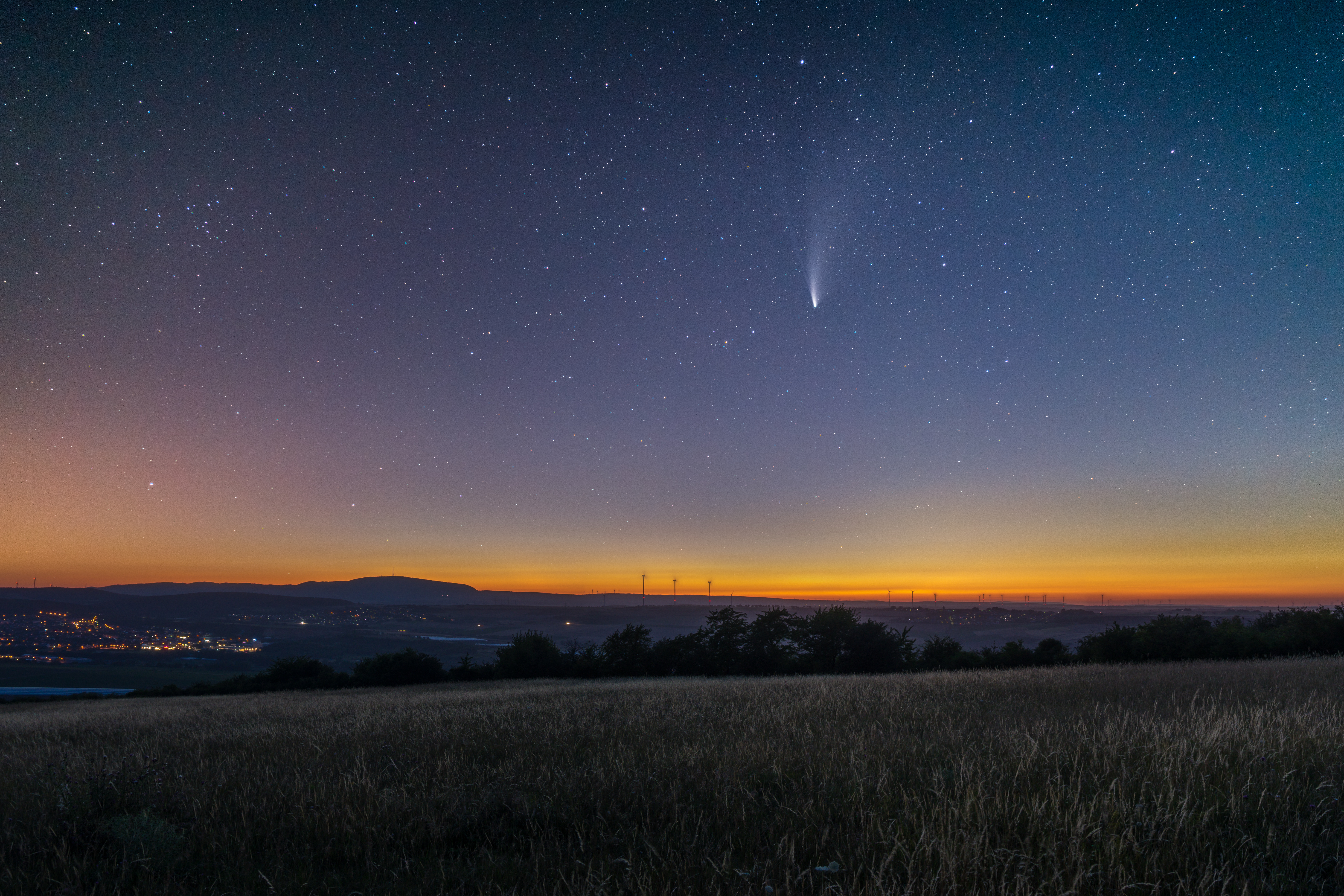 Das vorliegende Bild zeigt den Kometen C/2020 F3 (NEOWISE). Ich habe es am 21. Juli 2020 vom Grünstadter Bergaus aufgenommen. Es handelt sich um ein zusammengesetztes Bild, bei dem ich die Landschaft und den Sternenhimmel zu unterschiedlichen Uhrzeiten belichtet und kombiniert habe. Der Komet markiert relativ zu den Sternen laut Referenzbild des Stacks folgende Zeit: 23:35 Uhr (MESZ). Die Ausrichtung der Landschaft relativ zu den Sternen markiert laut eines später aufgenommenen Referenzbildes den Zeitpunkt 23:50 Uhr. Zu diesem Zeitpunkt war der Komet schon geringfügig gewandert relativ zu den Sternen, was bei dieser Weitwinkelaufnahme aber nicht auffällt; mir war es daher nur wichtig, das ansonsten die Sterne alle an der korrekten Position abgebildet werden. Die Landschaft habe ich bereits in der Dämmerung als Panorama aufgenommen, so dass ich später anhand des Referenzbildes einen deckungsgleichen Ausschnitt mit korrekter perspektivischer Projektion daraus wählen konnte bei der Bearbeitung.