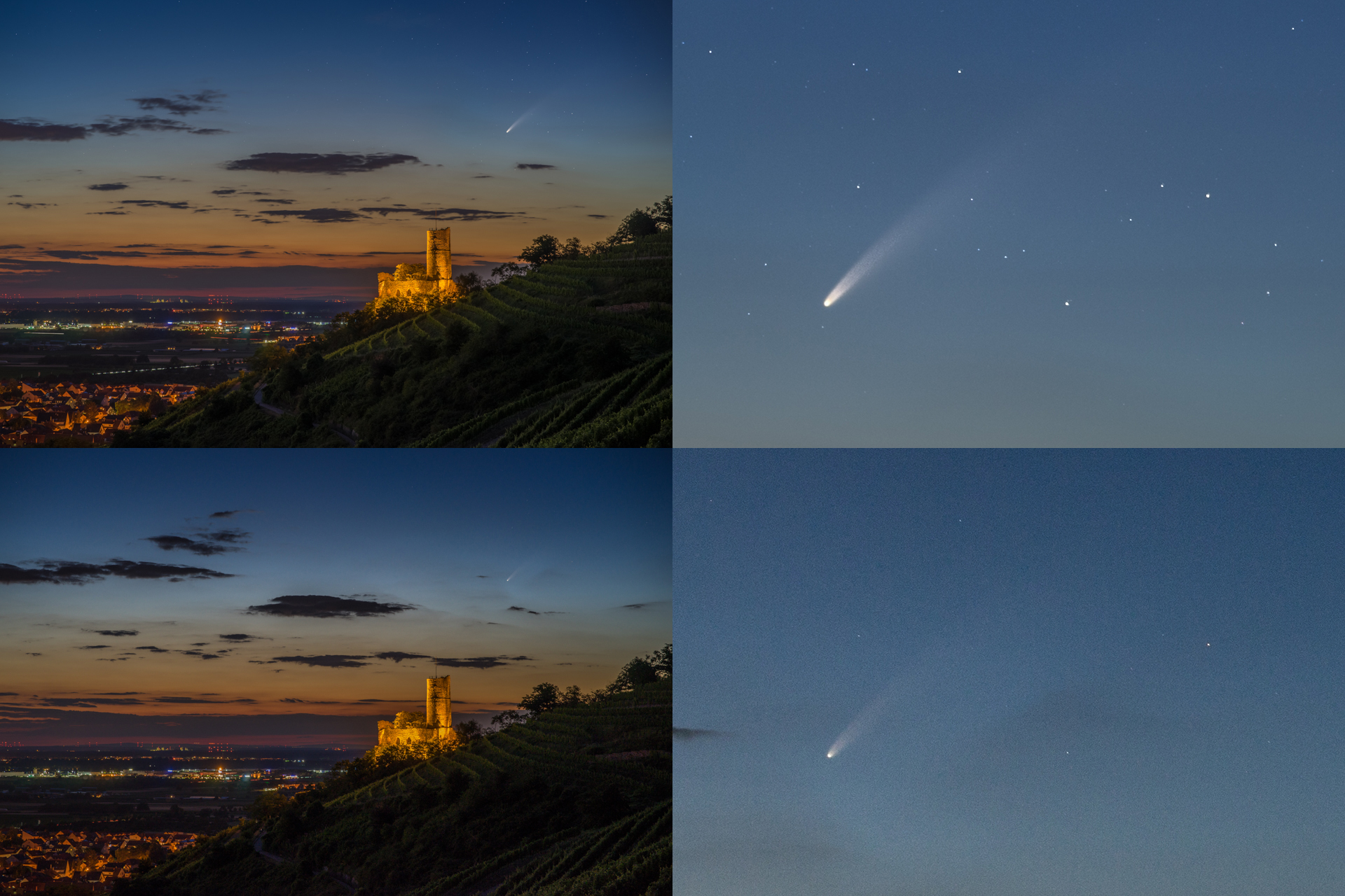 Bei meinem letzten Bildbeitrag "Komet C/2020 F3 (NEOWISE) über Schriesheim (überarbeitete Version)", der unter dem Link https://www.spektrum.de/alias/wunder-des-weltalls/komet-c-2020-f3-neowise-ueber-schriesheim-ueberarbeitete-version/1752022 abrufbar ist, hatte ich ausführlich beschrieben, wie ich viele Bilder zu einem Gesamtbild kombiniert habe. In diesem Zusammenhang kann sich durchaus eine Diskussion entfachen, wie realistisch ein Bild ist, das aus Bildern mit unterschiedlichen Belichtungszeiten mit und ohne Nachführung zusammengebaut wurde. Auf diesen Aspekt möchte ich in diesem Nachtrag zu meiner oben zitierten Bildveröffentlichung etwas eingehen. Links oben ist das besagte bereits veröffentlichte Bild zu sehen. Rechts oben zeige ich einen Detailausschnitt daraus, der den Bereich des Kometen abbildet. Links unten ist zum direkten Vergleich eine nachgeführte Einzelbeleuchtung mit 4s Belichtungszeit zu sehen. Wie der Detailausschnitt rechts unten zeigt, werden dank der Kompensation der Erdrotation der Komet und die umgebenden Sterne scharf abgebildet. Allerdings führt die Nachführung bereits bei dieser noch relativ kurzen Belichtungszeit zu einer Unschärfe in der Landschaft, und umgekehrt würde man ohne Nachführung unscharfe Sterne erhalten. Aus diesem Grund kombiniere ist bei solchen Aufnahmen grundsätzlich immer nachgeführte Aufnahmen mit Aufnahmen ohne Nachführung um Sterne und Landschaft gleichzeitig möglichst scharf abbilden zu können.