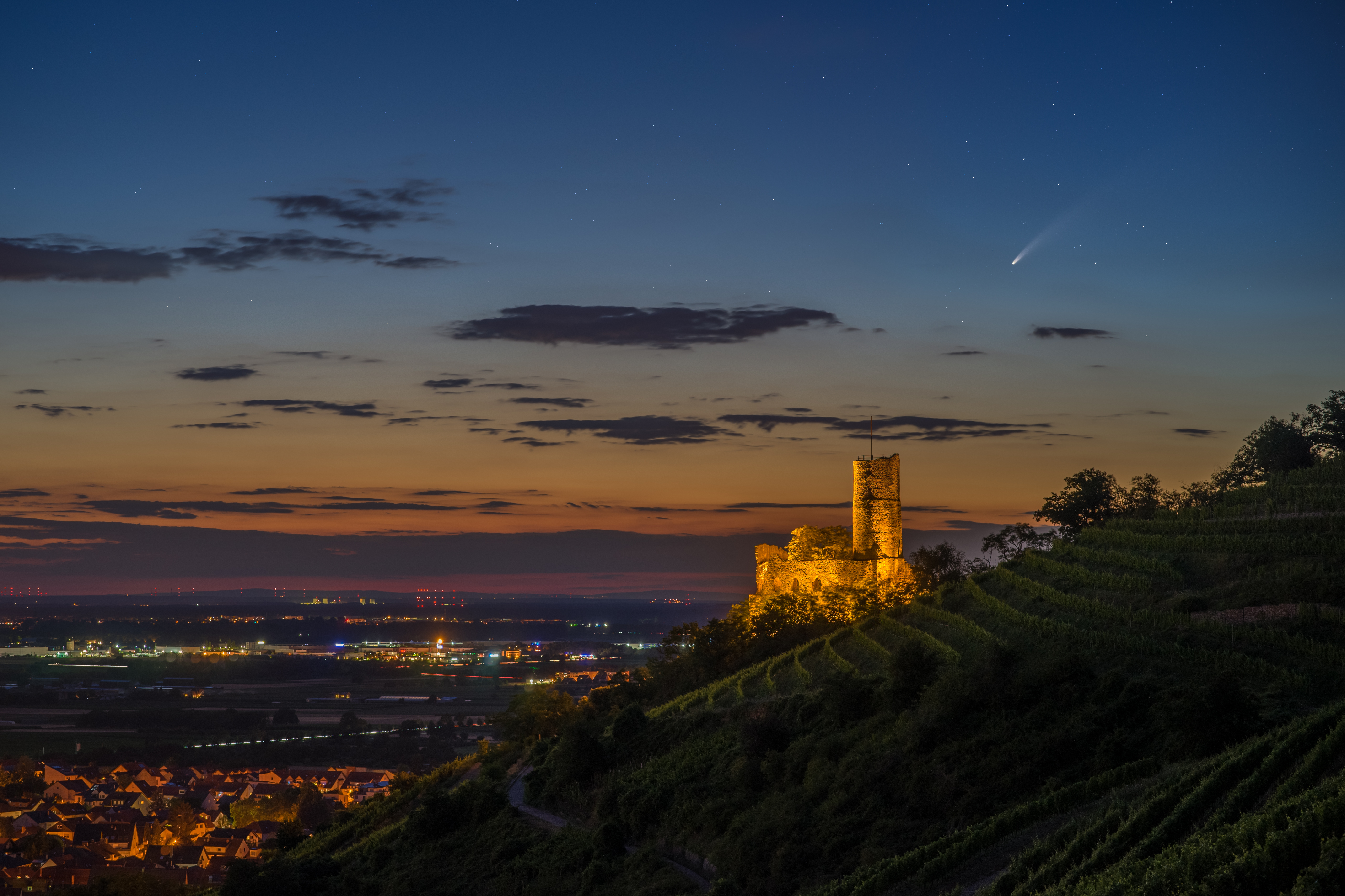 Am späten Abend des 11. Juli 2020 konnte ich den Kometen C/2020 F3 (NEOWISE) bereits mit bloßen Augen sehen und mit einem Fernglas genauer beobachten. Als Sahnehäubchen bot der Weinberg bei Schriesheim eine sehr schöne Kulisse, um dieses Naturspektakel fotografisch festzuhalten.