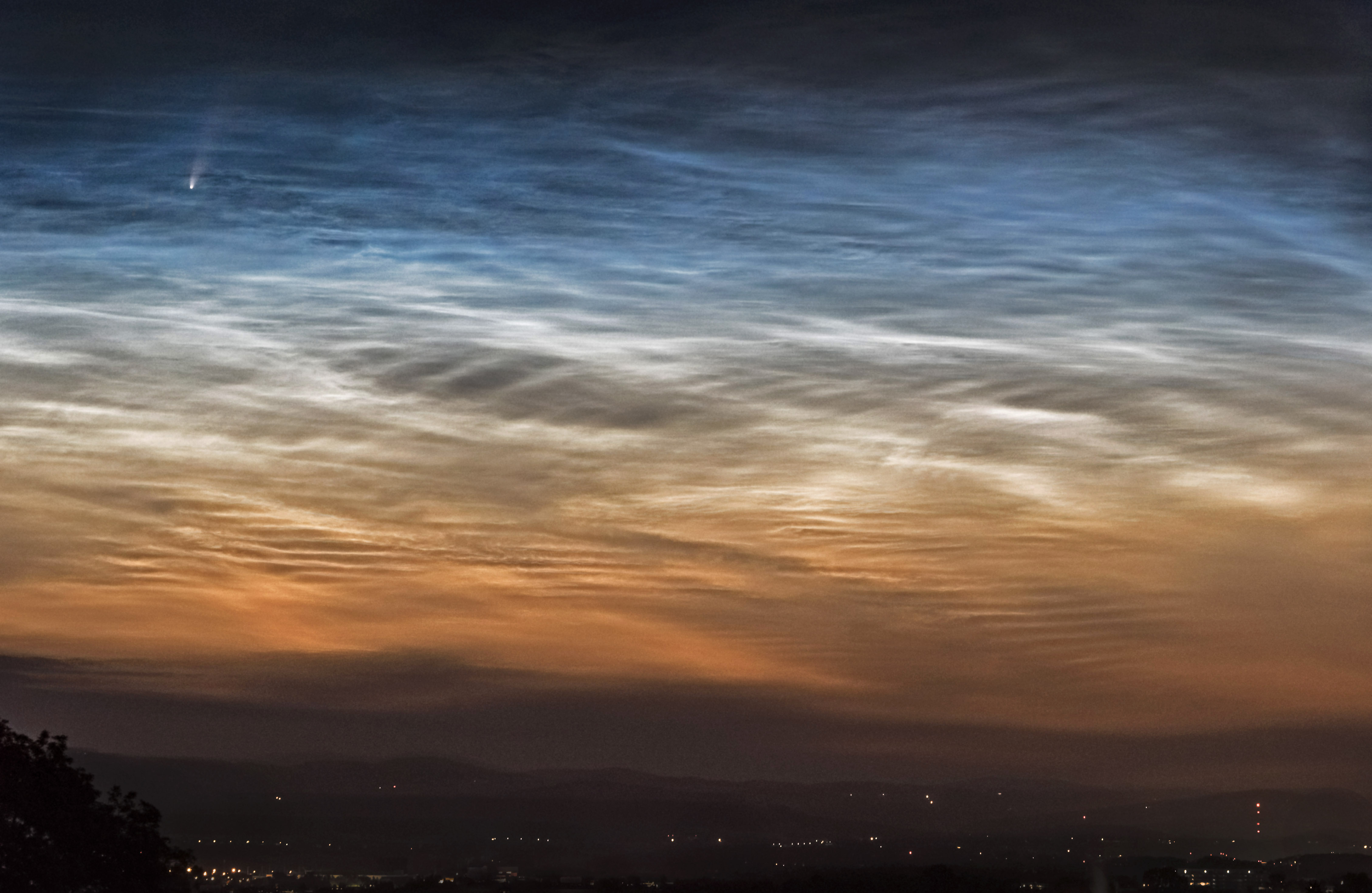In der Morgendämmerung des 8. Juli 2020 konnte man den Kometen C/2020 F3 NEOWISE tief am Horizont beobachten. Zur gleichen Zeit war auch ein seltenes atmosphärisches Naturschauspiel zu sehen: Außergewöhnlich hell leuchtende Nachtwolken (NLC). Es handelt sich dabei um Ansammlungen von Eiskristallen weit oberhalb der Troposphäre in rund 80 Kilometern Höhe.