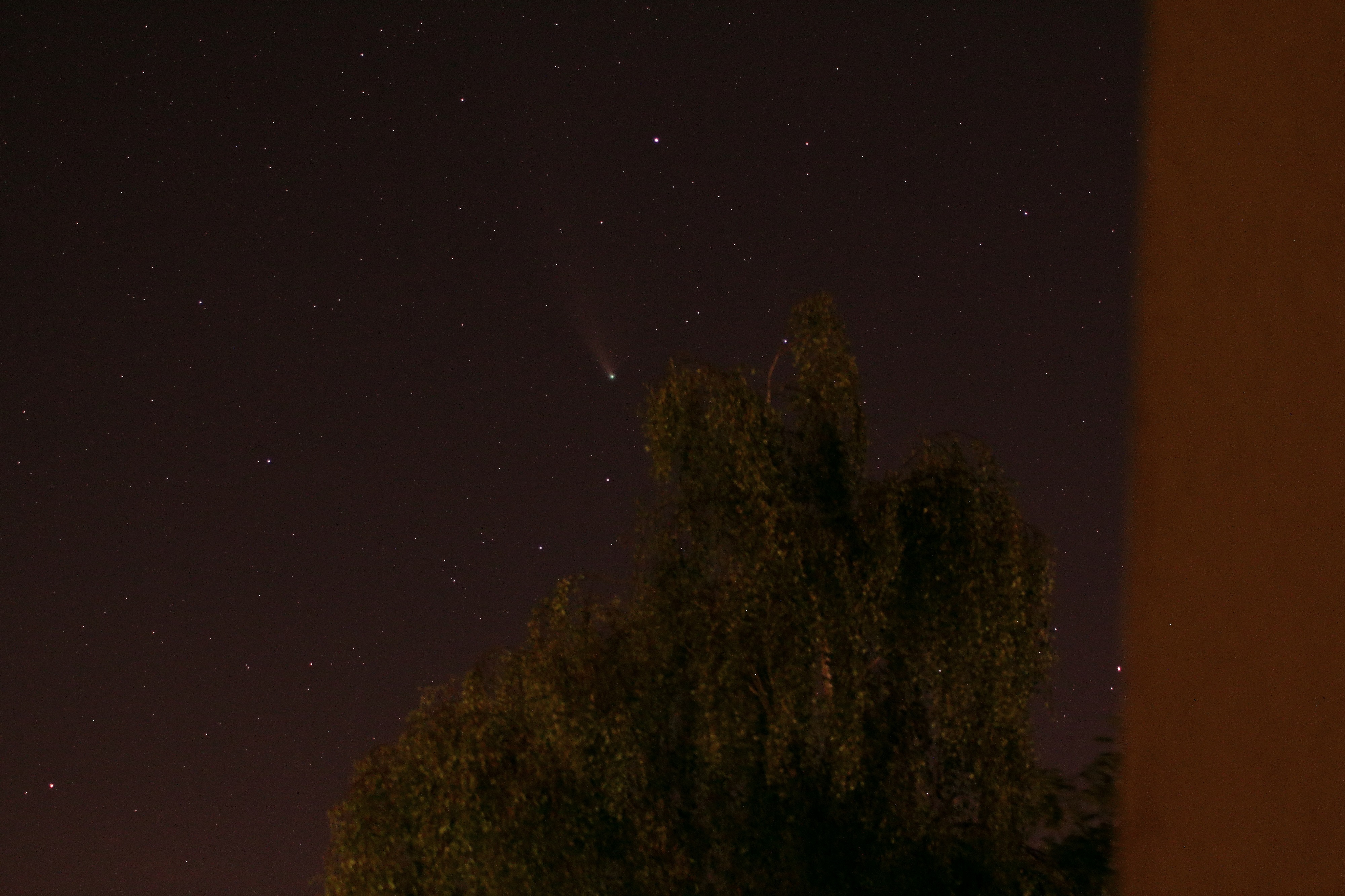 Die klare Nacht vom 24. auf den 25. Juli 2020 kam gerade recht, um noch einmal dem prächtigen Kometen »Neowise« fotografisch »auf die Pelle zu rücken«. Gegen Ende meiner Aufnahmesession wollte ich Neowise noch einmal als Widefield auf den Sensor meiner EOS 700 Da verewigen, mit einem benachbarten Baum in relativer Nähe zu meiner Hauswand. Ich konnte das Vorhaben gerade noch verwirklichen, bevor Neowise sich anschickte, hinter dem Baum zu verschwinden.