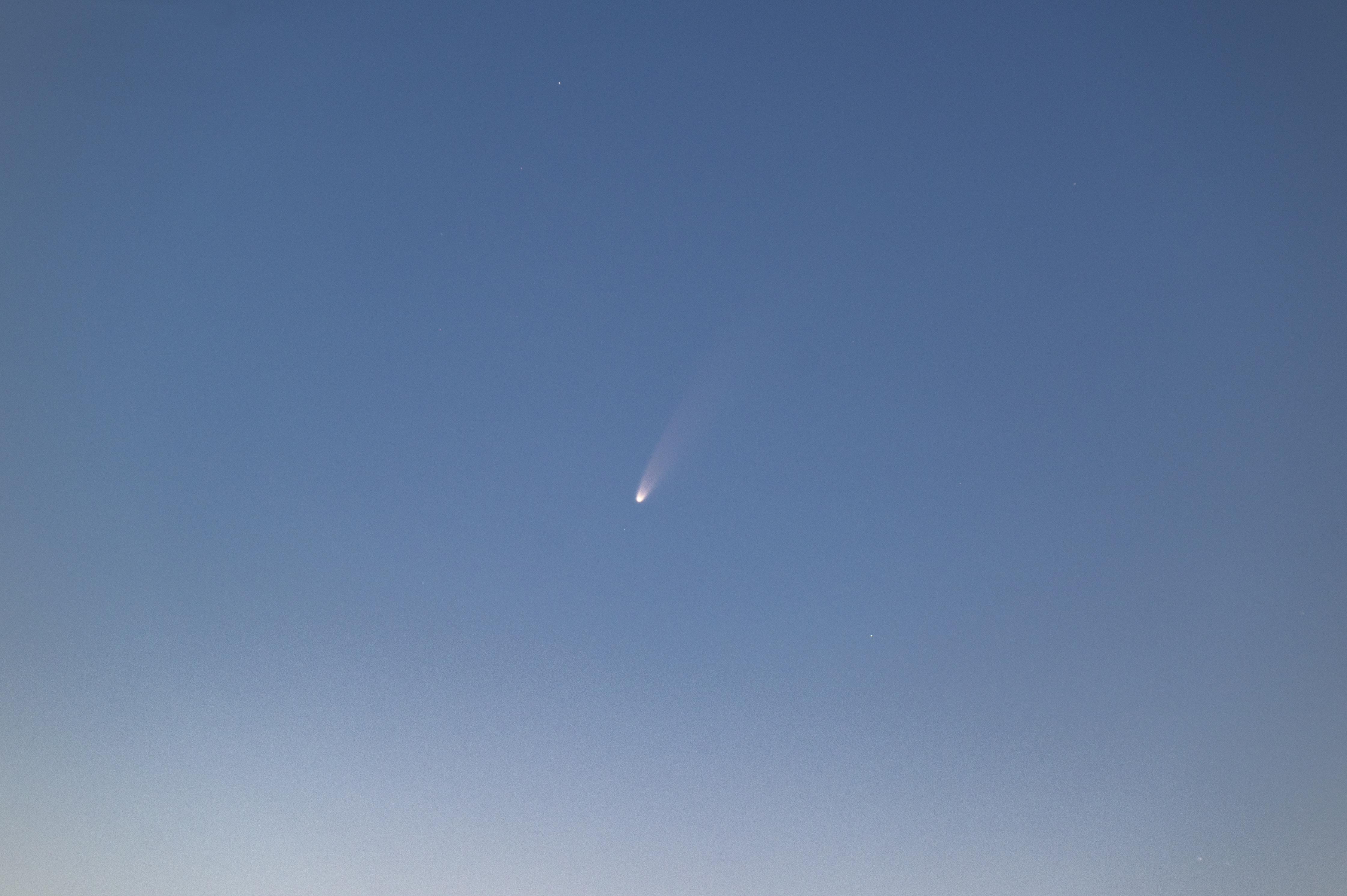 Nachdem es bereits im Ausland einige Sichtungen und Fotos des Kometen NEOWISE gab, klarte es in der Nacht zum 6. Juli endlich auf. Der Komet, der anders als die vielversprechenden Kollegen in der ersten Jahreshälfte die Umrundung der Sonne überlebt hat, ist sehr hell und mittlerweile mit bloßem Auge sichtbar. Auf dem Foto ist ein deutlicher Schweif erkennbar – bei freiem Horizont wäre er schon deutlich früher auffindbar gewesen!