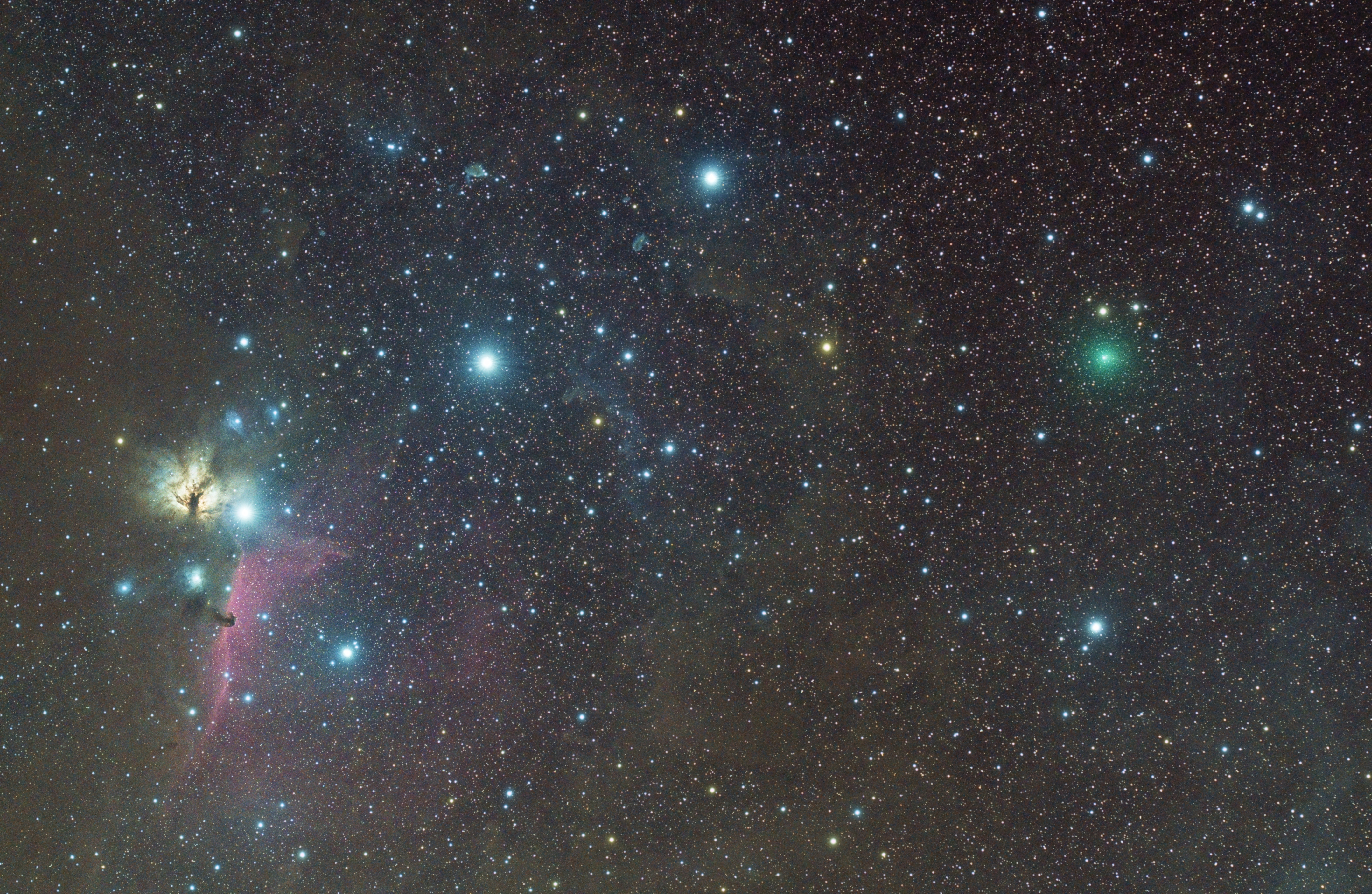 Anfang November stattete der Komet C/2020 M2 (ATLAS) der Region um die Gürtelsterne des Orion einen stattlichen Besuch ab. Trotz Mondlicht gelang es mir, diese Aufnahme umzusetzen.